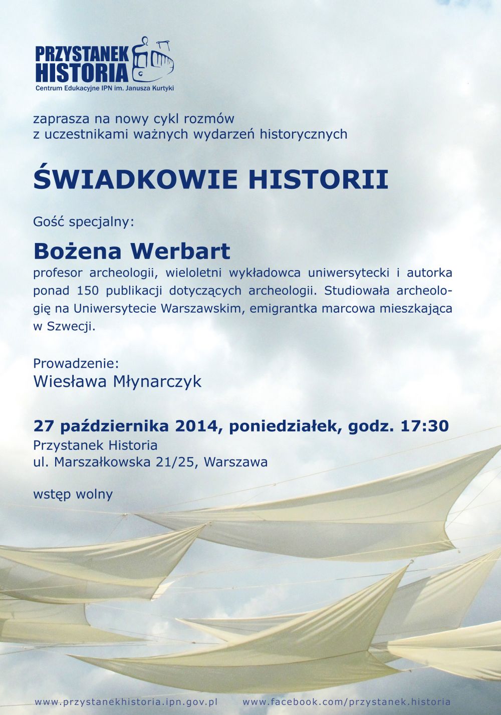W poniedziałek 27 października, o godz. 17:30, Przystanek Historia – Centrum Edukacyjne IPN im. Janusza Kurtyki przy ul. Marszałkowskiej 21/25 w Warszawie zaprasza na spotkanie ze świadkiem historii – Bożeną Werbart, emigrantką marcową. Bożena Werbart jest profesorem archeologii, wieloletnim wykładowcą uniwersyteckim i autorką ponad 150 publikacji. Studiowała archeologię na Uniwersytecie Warszawskim. Relegowana ze studiów za udział w „Marcu 68", oficjalnie została przyjęta z powrotem w 1970 r. W 1971 r. uzyskała dyplom magisterski i wkrótce potem wyjechała do Szwecji.