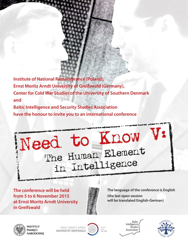 Instytut Pamięci Narodowej – Komisja Ścigania Zbrodni przeciwko Narodowi Polskiemu, Centrum Badań nad Zimną Wojną Uniwersytetu Południowej Danii, Ernst Moritz Arndt University w Greifswald oraz Baltic Intelligence and Security Studies Association zapraszają do udziału w międzynarodowej konferencji naukowej „Need to Know V: The Human Element in Intelligence”. Konferencja odbędzie się na Uniwersytecie w Greifswaldzie (Niemcy) w dniach 5–6 listopada 2015 r.
