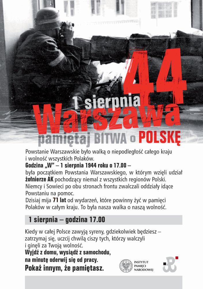 Pamiętajmy, że 1 sierpnia 1944 roku wybuchło Powstanie Warszawskie. Uczcijmy jego pamięć w sobotę, 1 sierpnia 2015. O godzinie 17:00, gdy w całej Polsce zawyją syreny, zatrzymajmy się i uczcijmy chwilą ciszy tych, którzy walczyli za naszą wolność.