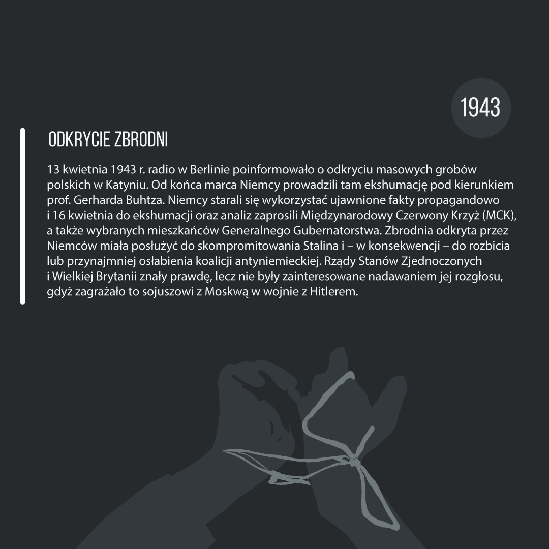 Infografiki przedstawiają historię zbrodni katyńskiej – od genezy do tragicznego wydarzenia. Przygotowany materiał edukacyjny może być prezentowany w całości, a także oddzielnie, jako materiał pomocniczy na lekcjach poświęconych rocznicy 17 września, tematyce obozowej czy wreszcie mordu w Katyniu. Plansze mogą stanowić pomoc dydaktyczną nie tylko na lekcjach historii i wiedzy o społeczeństwie, ale także języka polskiego i godziny wychowawczej. Przeznaczeniem grafik jest prezentacja multimedialna w trakcie zajęć lekcyjnych – można je pobrać także do wydruku w celu sporządzenia miniwystawy lub zaprezentować w gablotach i gazetkach szkolnych.