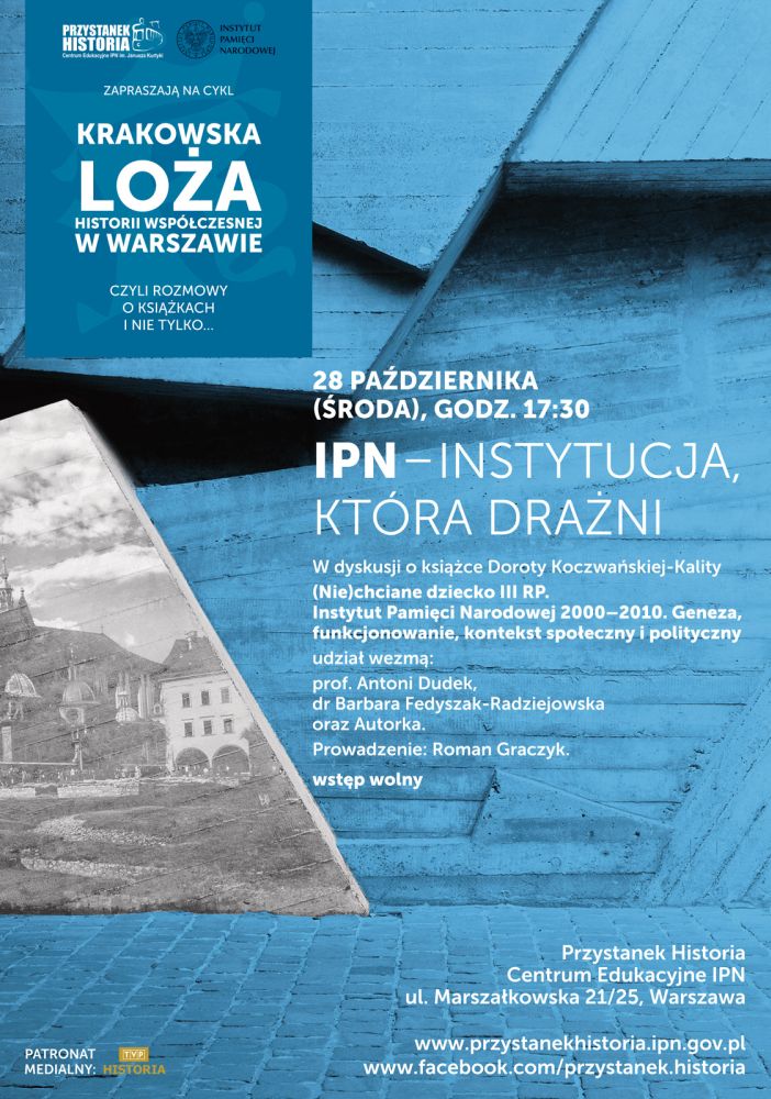 28 października (środa), o godz. 17:30, zapraszamy do Centrum Edukacyjnego IPN im. Janusza Kurtyki Przystanek Historia na spotkanie z cyklu Krakowska Loża Historii Współczesnej w Warszawie. To kolejna odsłona dyskusji o książkach poświęconych historii najnowszej. Październikowe spotkanie, zatytułowane „IPN – instytucja, która drażni”, poświęcone będzie publikacji Doroty Koczwańskiej-Kality (Nie)chciane dziecko III RP. Instytut Pamięci Narodowej 2000–2010. Geneza, funkcjonowanie, kontekst społeczny i polityczny.