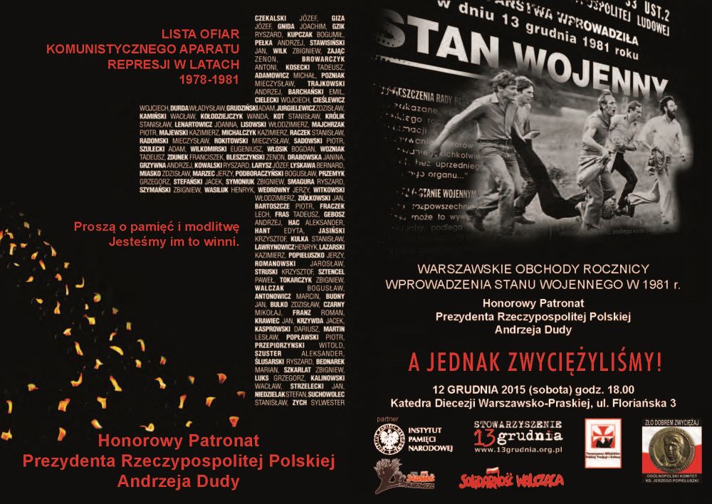 12 grudnia 2015 r. (sobota), o godzinie 18:00, w katedrze warszawsko-praskiej, przy ul. Floriańskiej 3, odbędą się uroczystości upamiętniające 34. rocznicę wprowadzenia stanu wojennego w Polsce.