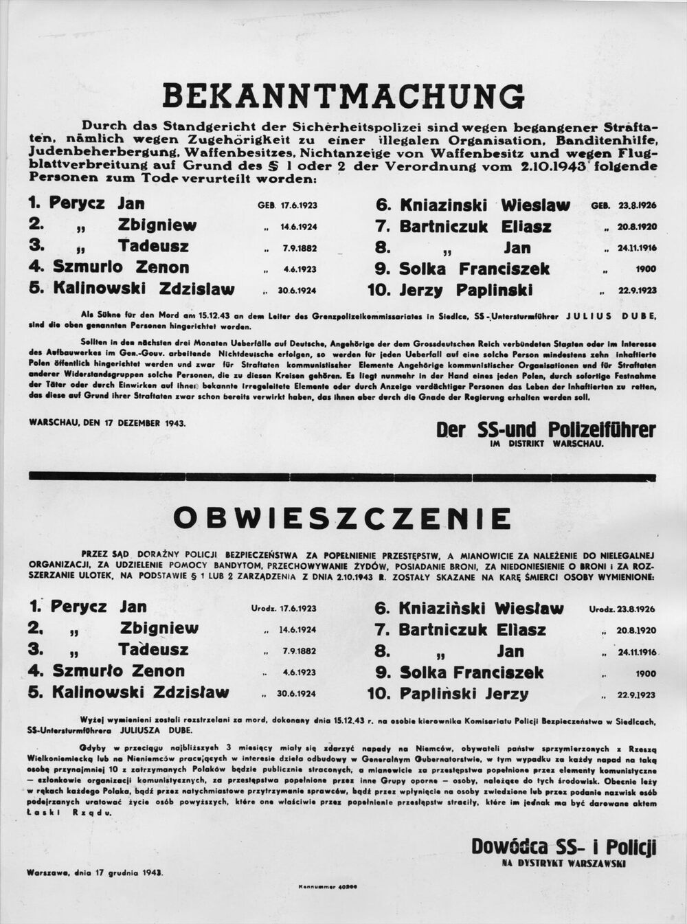 Na wielu obwieszczeniach o zbiorowych egzekucjach był podpisany niewymieniony z nazwiska „dowódca SS i policji na dystrykt warszawski”. Działająca w podziemiu Armia Krajowa zdołała ustalić, że za represje wobec Polaków odpowiadał Franz Kutschera.