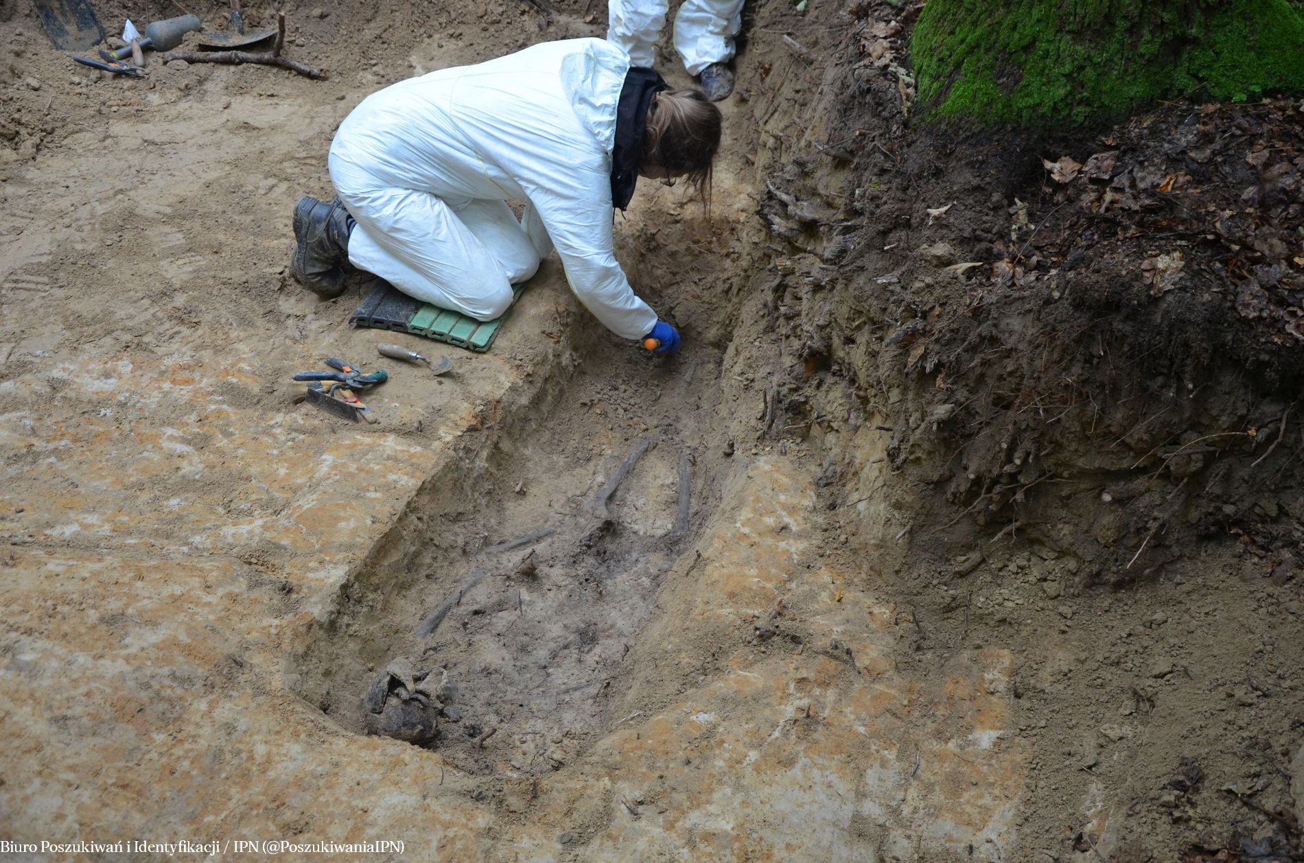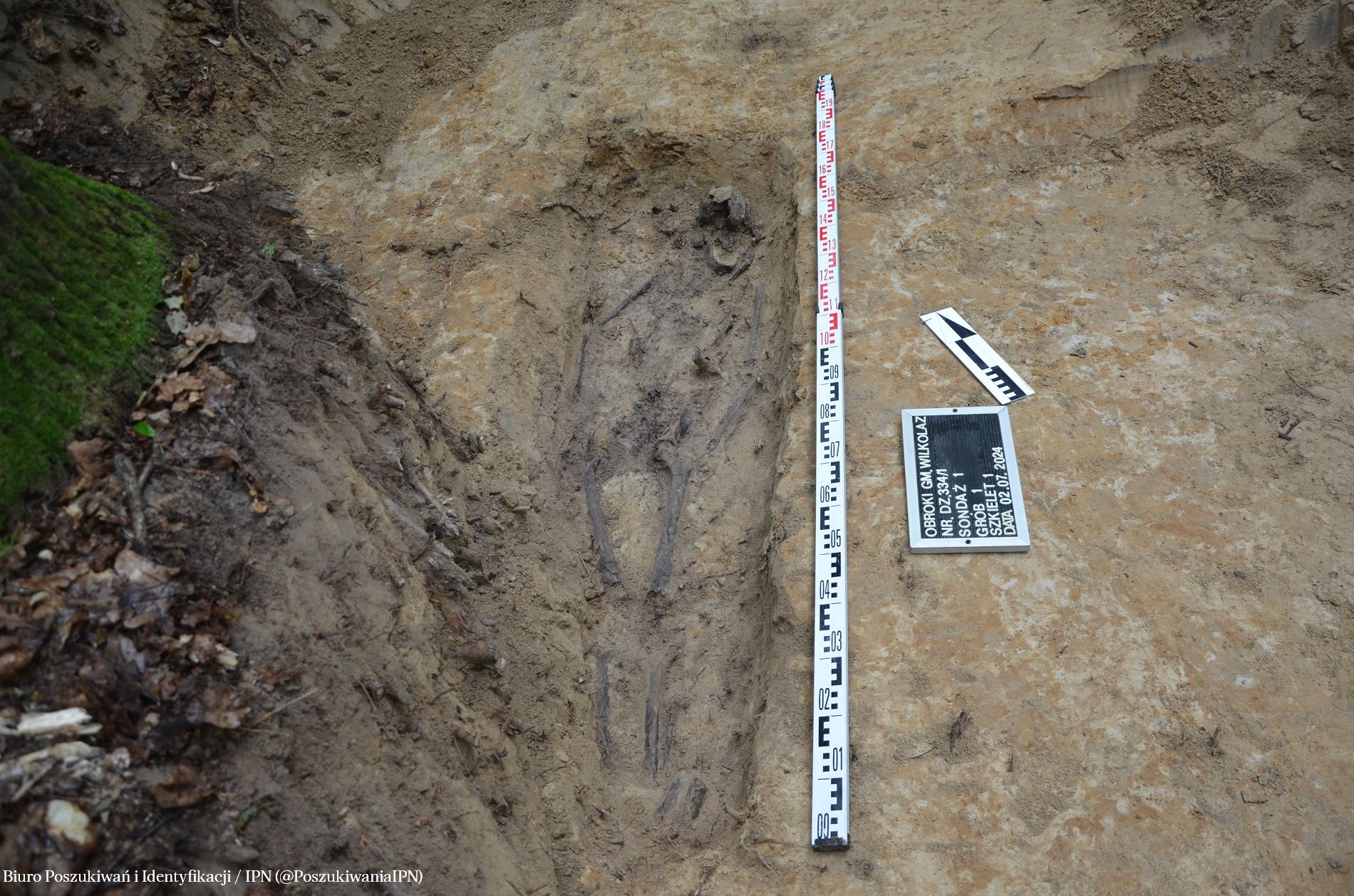W toku przeprowadzonych prac ujawniono szczątki mężczyzny, które były ułożone w układzie anatomicznym. Spoczywały one najprawdopodobniej w trumnie lub prowizorycznej skrzyni. Z uwagi na zły stan zachowania szkieletu, spowodowany m.in. erozją i sąsiedztwem drzewa, nie można było na etapie podejmowania określić przyczyny śmierci. Wiek określono wstępnie na ok. 40-50 lat. Przy szczątkach odnaleziono pozostałości obuwia.