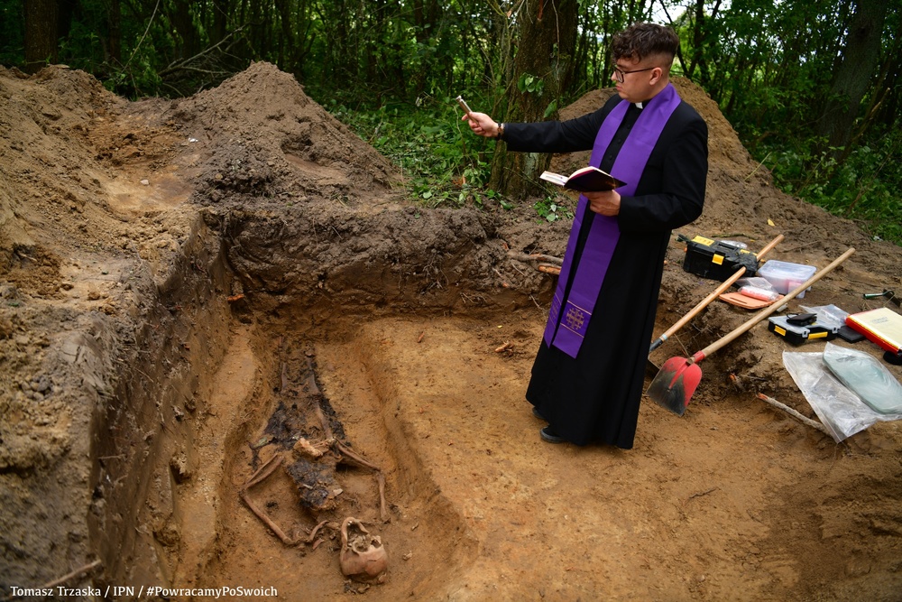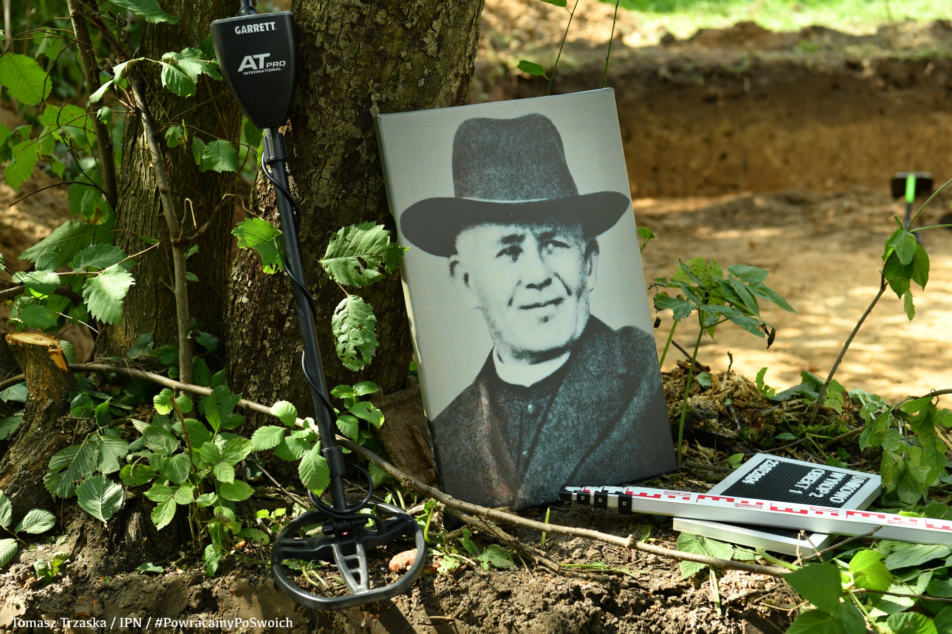 Prace na terenie ogrodu należącego niegdyś do państwa Kroschewskich przeprowadzono w dniach 23-24 lipca 2024 r. W badanym miejscu wykonano dwa sondaże. W drugim z nich odkryto wkop, który swoim kształtem przypominał jamę grobową. Podczas eksploracji ww. miejsca natrafiono na szczątki mężczyzny ubranego w szaty liturgiczne (w jamie grobowej zachowały się ich pozostałości). Przy szczątkach odnaleziono także m.in. różaniec. Ciało zostało pochowane w ziemi, bez trumny. Odkryte szczątki spoczywały w układzie anatomicznym, a ich ułożenie wskazuje na pochówek przeprowadzony z szacunkiem do osoby zmarłej (w odróżnieniu od tajnych pochówków ofiar zbrodni komunistycznych).