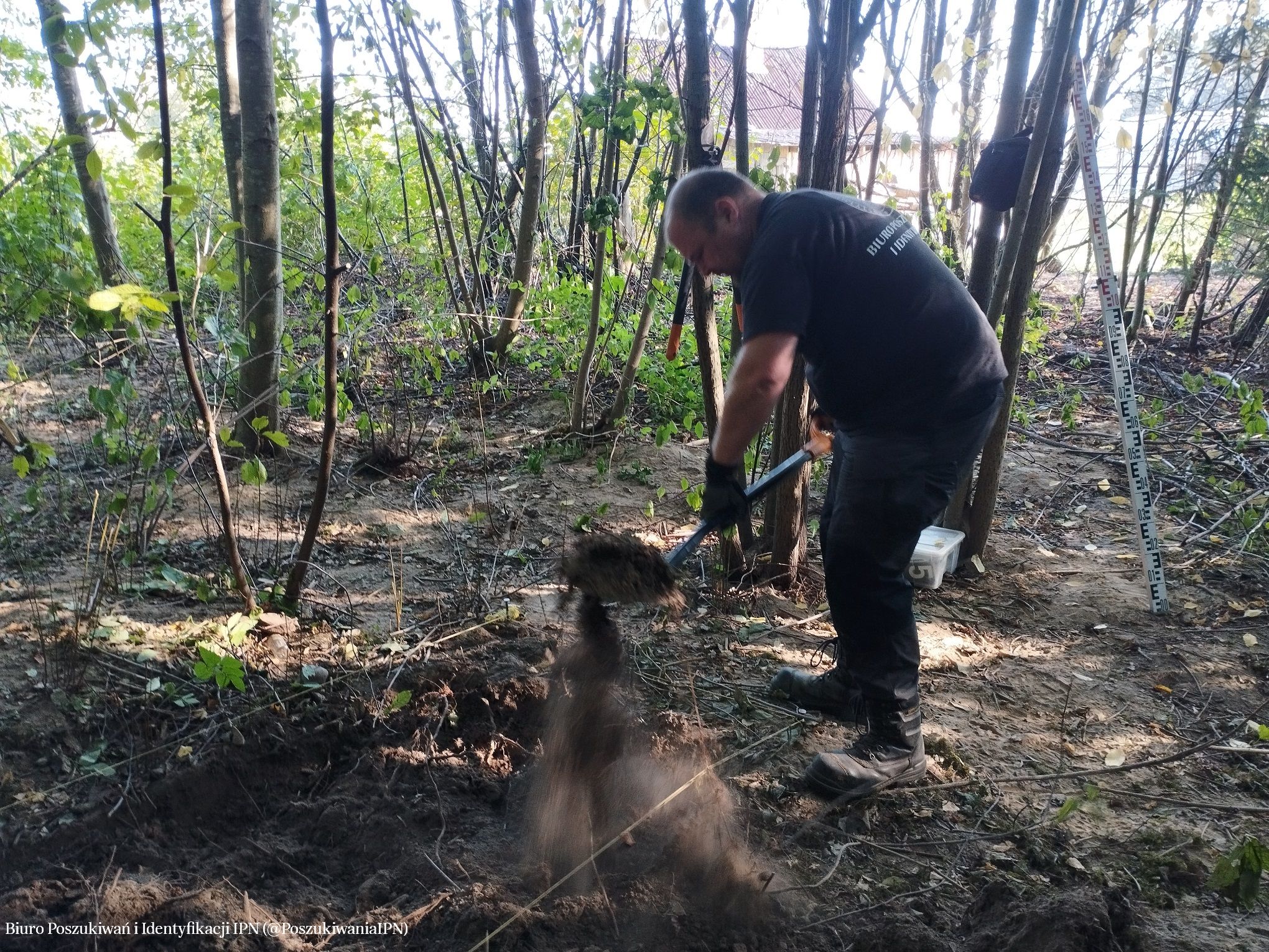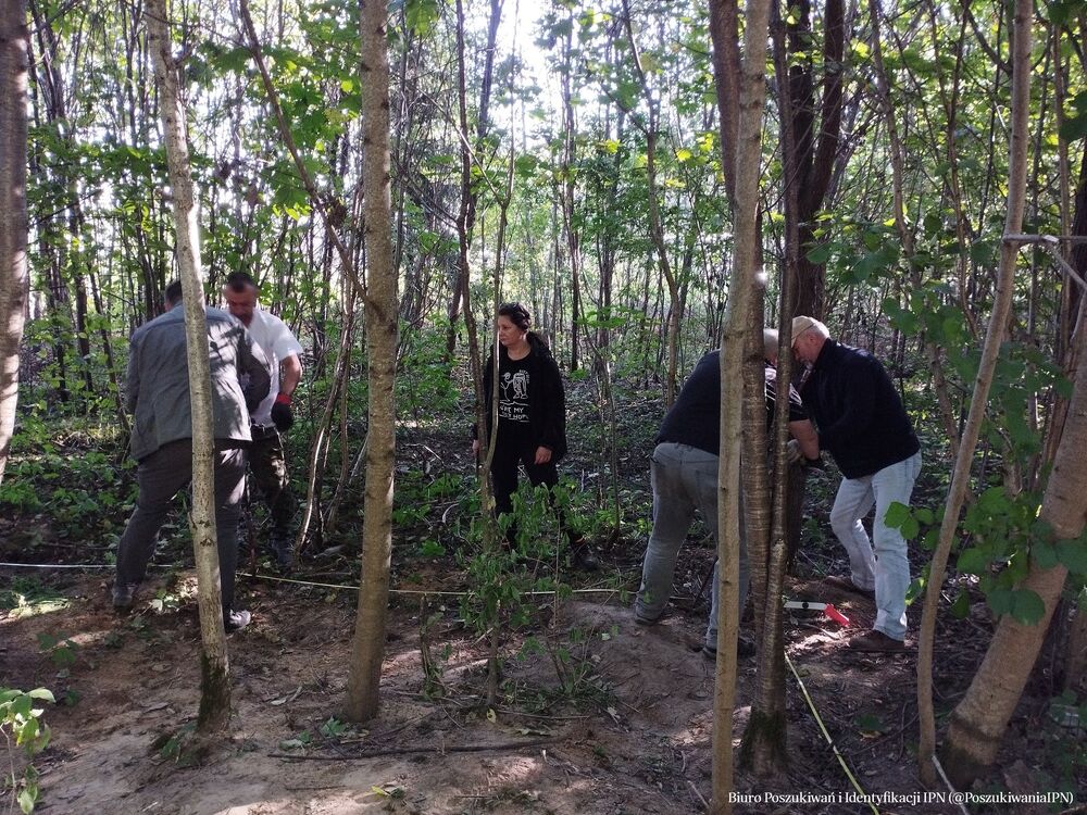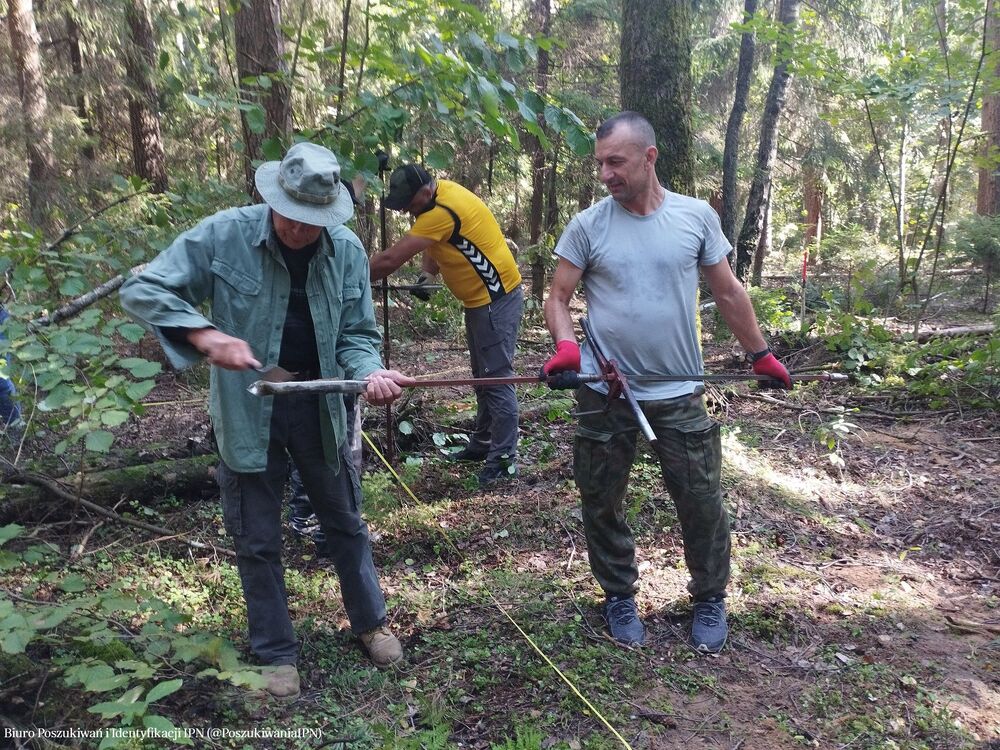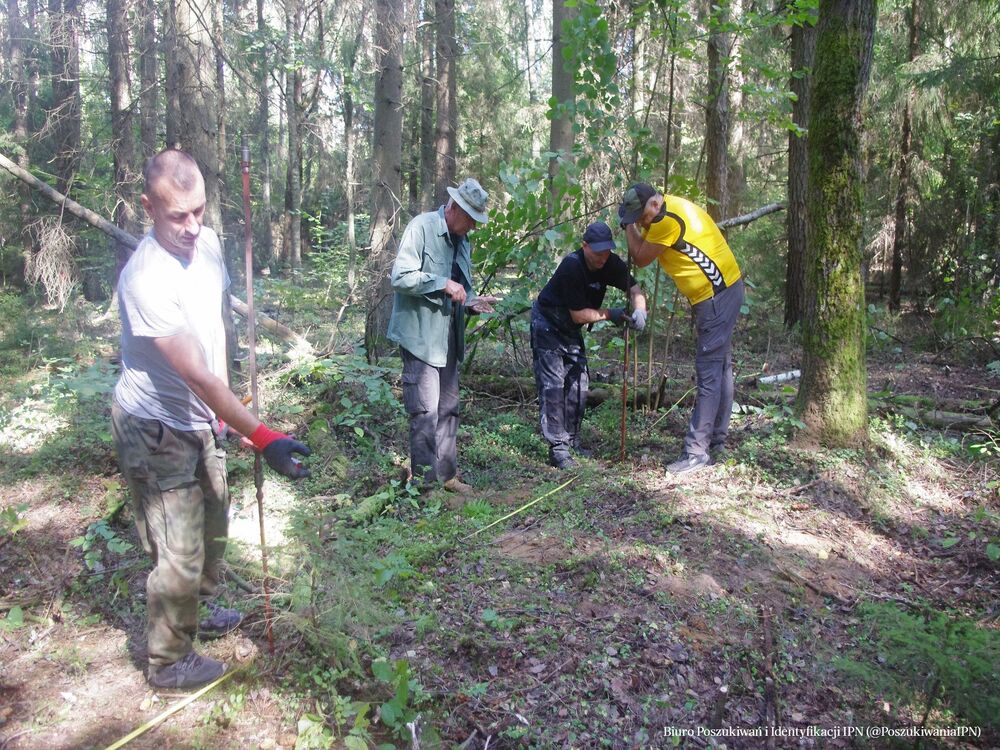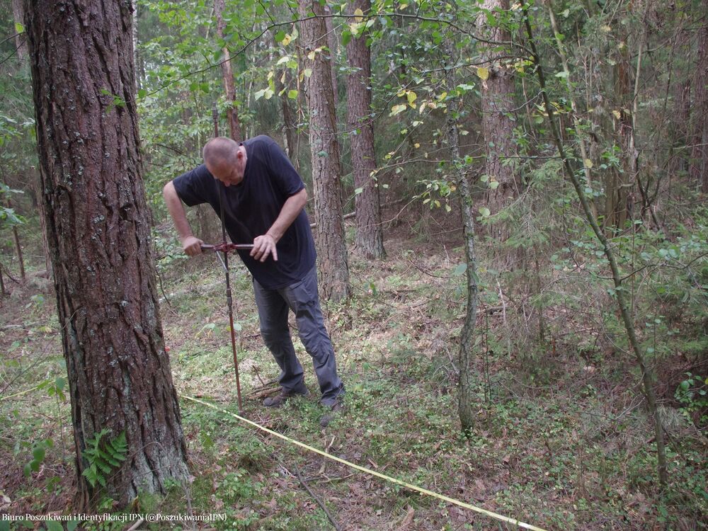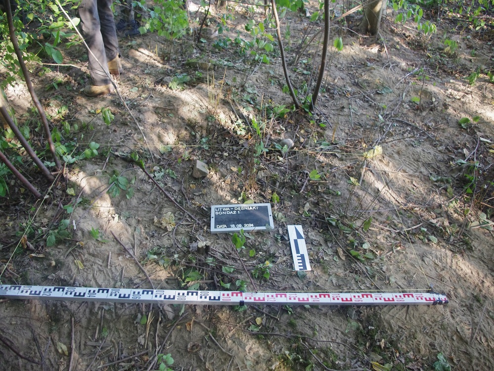 W dniach 17 – 20 września 2024 r. zespół pracowników Biura Poszukiwań i Identyfikacji IPN przeprowadził badania terenowe na obszarze należącym dawniej do wsi Dębniaki (obecnie jest to teren w granicach administracyjnych Wilna). Prace przeprowadzone zostały na terenie, który wskazała pani Krystyna Sobotkiewicz (z domu Warłamówna) jako miejsce pochówku polskiego ułana, który zginął we wrześniu 1939 r. Zapamiętała, że niedługo po 17.09.1939 r., w niedużej odległości od jej rodzinnego gospodarstwa, ułani polscy stoczyli bój z sowietami. Polacy przegrali potyczkę. Trzech z nich dobiegło do domu państwa Warłamów przez lasek. Zdjęli mundury i założyli odzież cywilną, którą otrzymali od gospodarza a konie puścili wolno. Żołnierze przynieśli ze sobą towarzysza broni, który, gdy dotarli do Dębniaków, już nie żył. Został pochowany w lasku, nieopodal domu. W miejscu pochówku, które wskazała pani Krystyna, ojciec posadził brzózkę. O drzewo dbała cała rodzina. Wokół rosły również inne drzewa – sosny, świerki. Wspomnianą brzozą rodzina pani Krystyny opiekowała się do czasu, gdy się stamtąd wyprowadzono (około 1980 r.). Wówczas dom został zburzony. Z lasu zaś korzystali okoliczni mieszkańcy. Wiele drzew, w tym wspominana brzoza zostało wyciętych. W wyniku przeprowadzonej kwerendy i analizy archiwalnych materiałów kartograficznych (przedwojenne mapy, zdjęcie lotnicze z 1944 r.) ustalono obszar prac. Wykonano 749 sondaży wiertniczych oraz założono sześć wykopów sondażowych w miejscach, w których wystąpiły zakłócenia gruntu. Grobu nie odnaleziono. Prace będą kontynuowane w kolejnym roku.