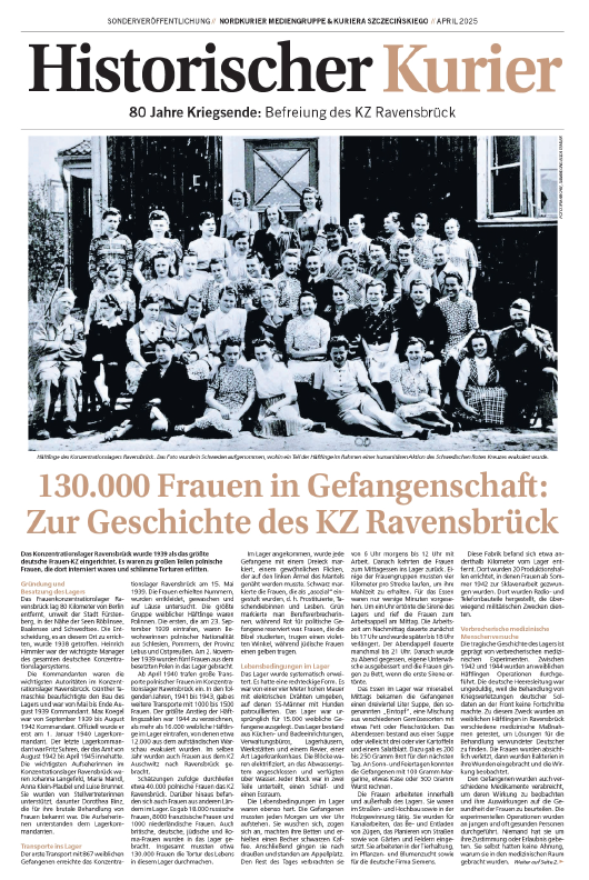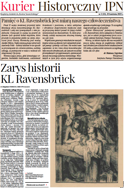 W 80. rocznicę oswobodzenia obozu przygotowaliśmy specjalny dodatek prasowy „Kurier Historyczny IPN” – jednobrzmiący materiał wydany w języku polskim w weekendowym „Kurierze Szczecińskim” i przetłumaczony na język niemiecki w „Nordkurierze” – ukazującym się w nakładzie 80 tys. egzemplarzy, największym dzienniku Meklemburgii-Pomorza Przedniego. Przedstawia on historię niemieckiego obozu koncentracyjnego Ravensbrück – jego powstanie, warunki życia w obozie, transporty a także prowadzone w nim zbrodnicze eksperymenty medyczne. Kolejny artykuł dotyczy podobozu w Königsberg in der Neumarkt (dzisiejsza Chojna). W „Kurierze Historycznym IPN” możemy także przeczytać wspomnienia więźniarek, poznać postać zasłużonej dla Szczecina Heleny Kurcyuszowej, a także dowiedzieć się o obozie męskim Ravensbrück.