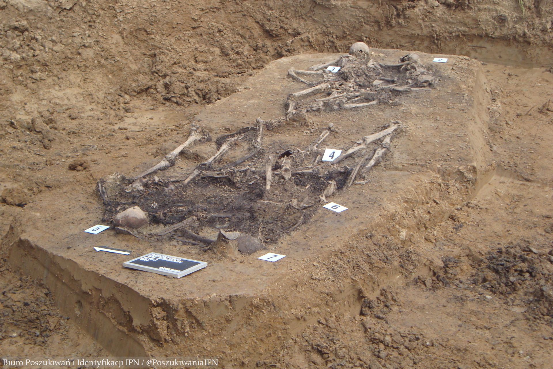 W wyniku przeprowadzonych wizji lokalnych, relacji świadków oraz analizy archiwalnych zdjęć lotniczych wytypowano obszar poszukiwań, którym był fragment współczesnego pola, zlokalizowany na terenie nieistniejącego już gospodarstwa. Odnaleziono tam miejsce pochówku co najmniej ośmiu osób. W ramach wstępnych badań antropologicznych ustalono, że przynajmniej kilka z nich to kobiety. W płytkim grobie zbiorowym na głębokości kilkudziesięciu centymetrów większość ofiar leżała twarzą do ziemi, a niektóre jedna na drugiej. Przy szkieletach znajdowały się rzeczy osobiste takie jak różańce, medaliki i obrączki.