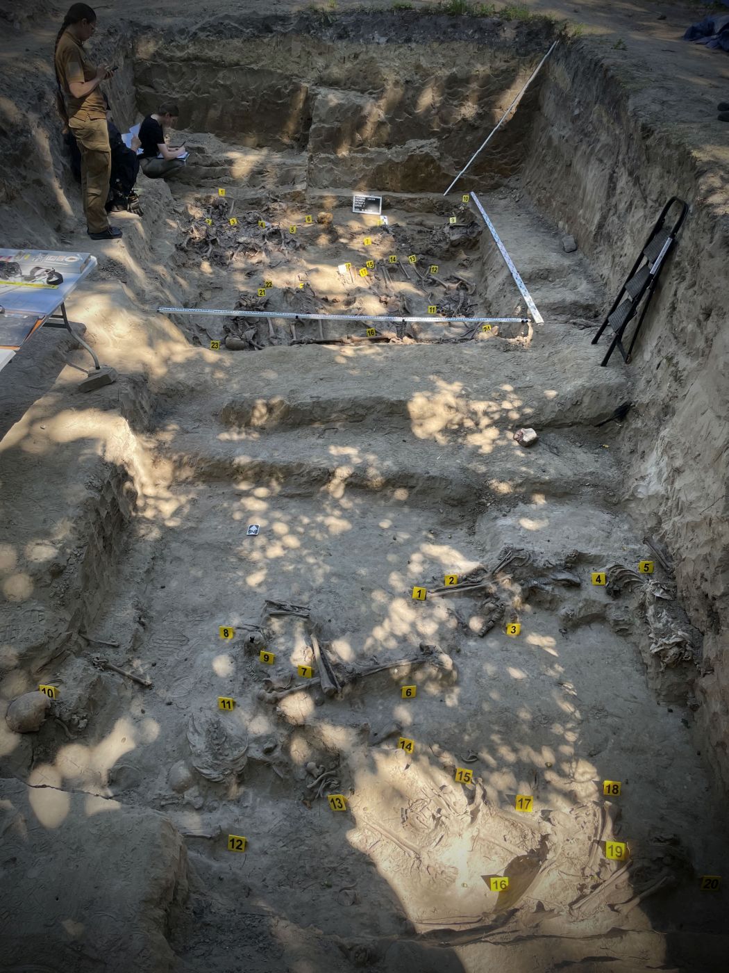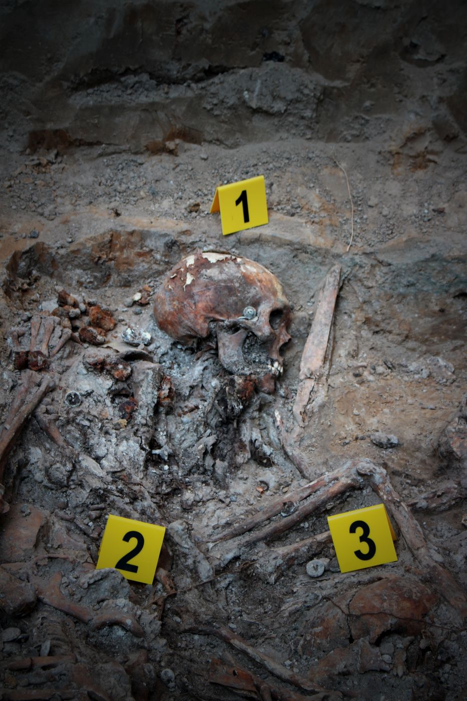 W trakcie prac ekshumacyjnych ujawniono dwa zbiorowe groby, w których znajdowały się szczątki 31 osób oraz wiele szczątków luźnych należących najprawdopodobniej do kolejnych kilkudziesięciu ofiar. Tak duża liczba szczątków luźnych wynika z faktu częściowego zniszczenia mogiły przez pochówki wtórne, jak i okoliczności śmierci żołnierzy poległych na polu walki po ciężkim ostrzale artyleryjskim, który mógł spowodować rozległe obrażenia ciał. Ostateczna liczba ofiar, których szczątki ekshumowano zostanie ustalona w wyniku dalszych badań antropologicznych i genetycznych.