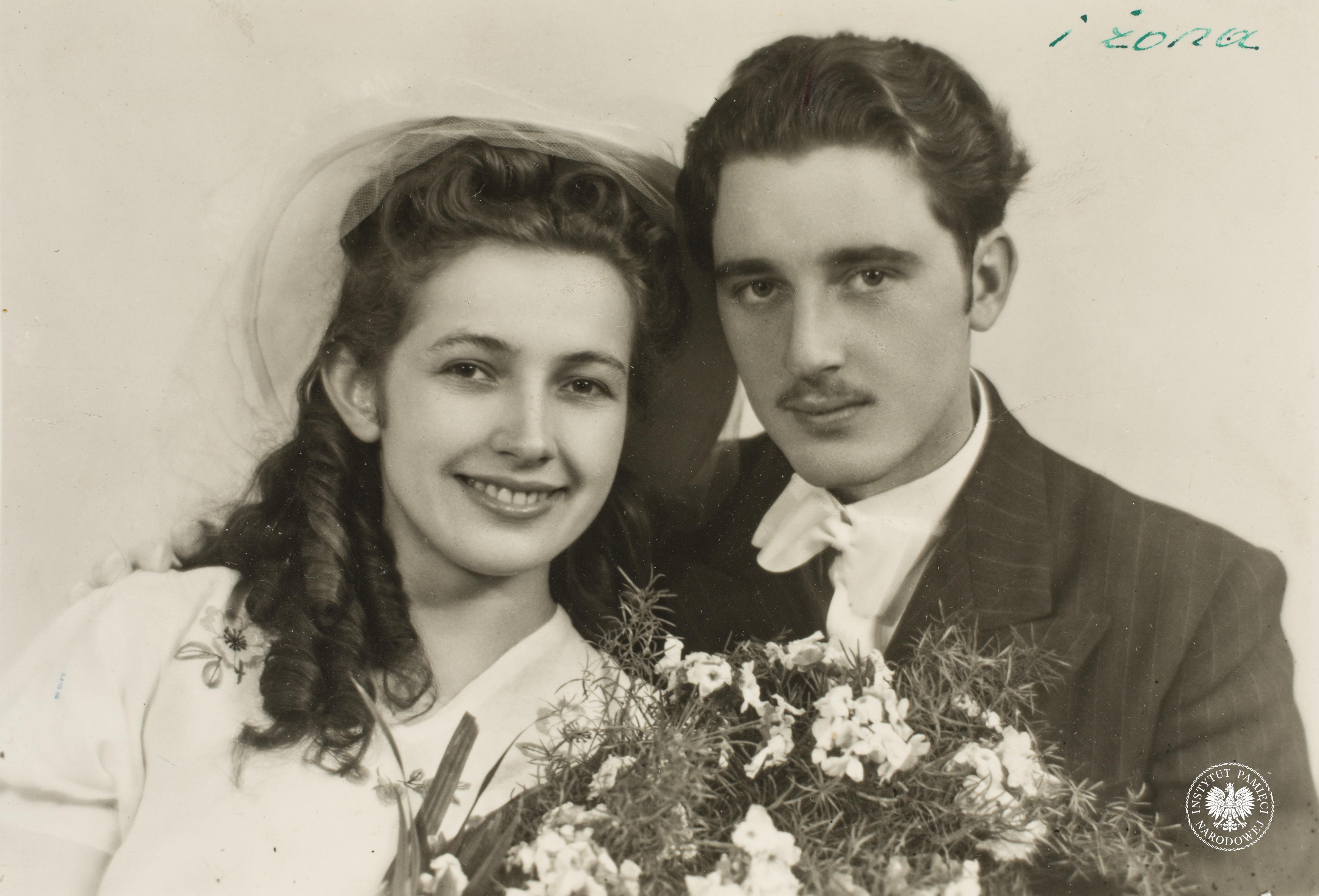Fotografia ślubna Jana Matei ps. Jawor, siedzi pośrodku wraz z żoną Heleną, fot. AIPN, sygn. IPNKr-3-3-23-10-131 -