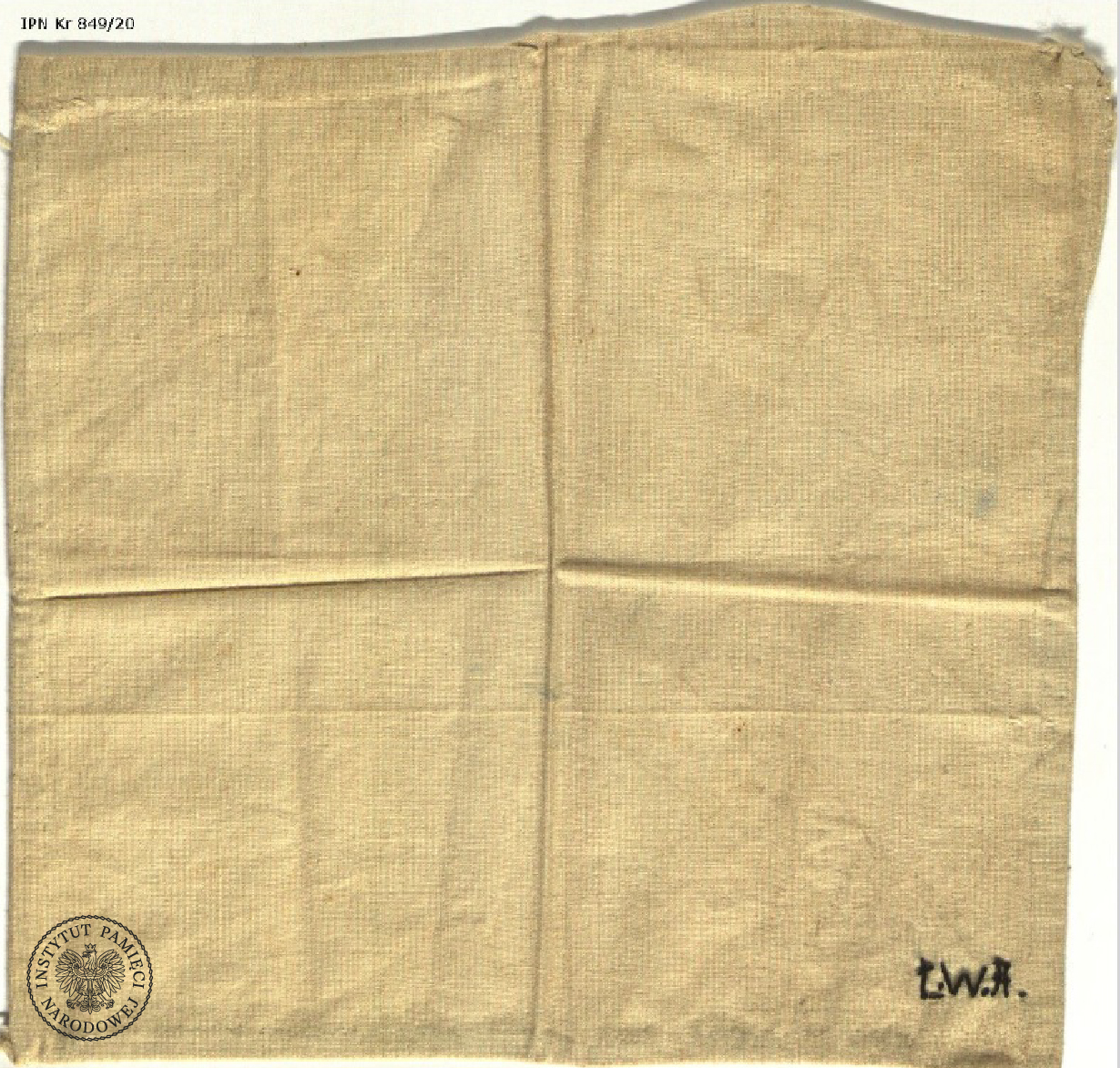 Chusteczka, w której obszytych brzegach ppłk Łukasz Ciepliński przemycał grypsy pisane w celi więzienia przy ul. Rakowieckiej w Warszawie. Dar prywatny: Mieczysław Wałęga, Janusz Kurtyka, w zasobie AIPN, sygn. IPN Kr 849/20 -