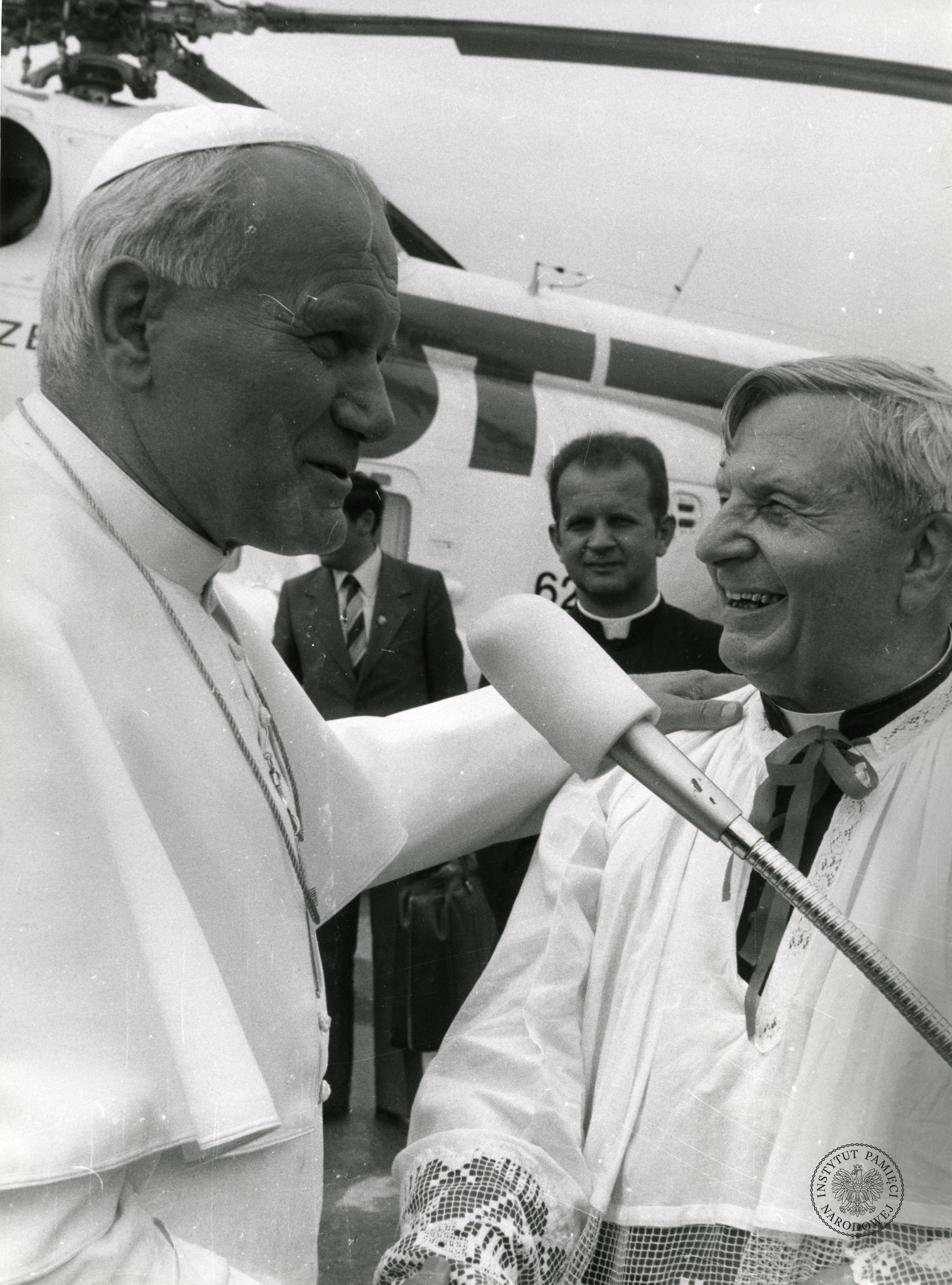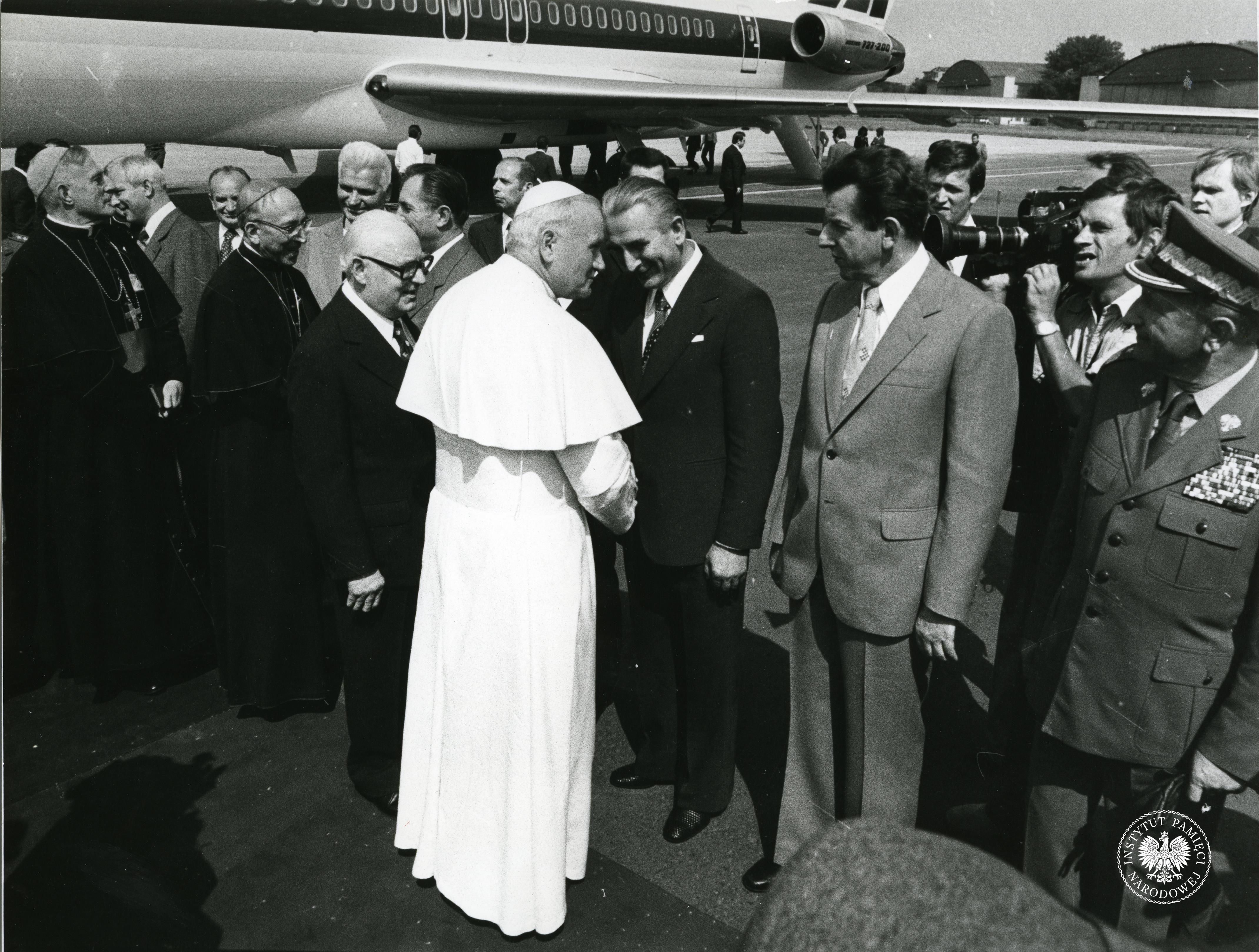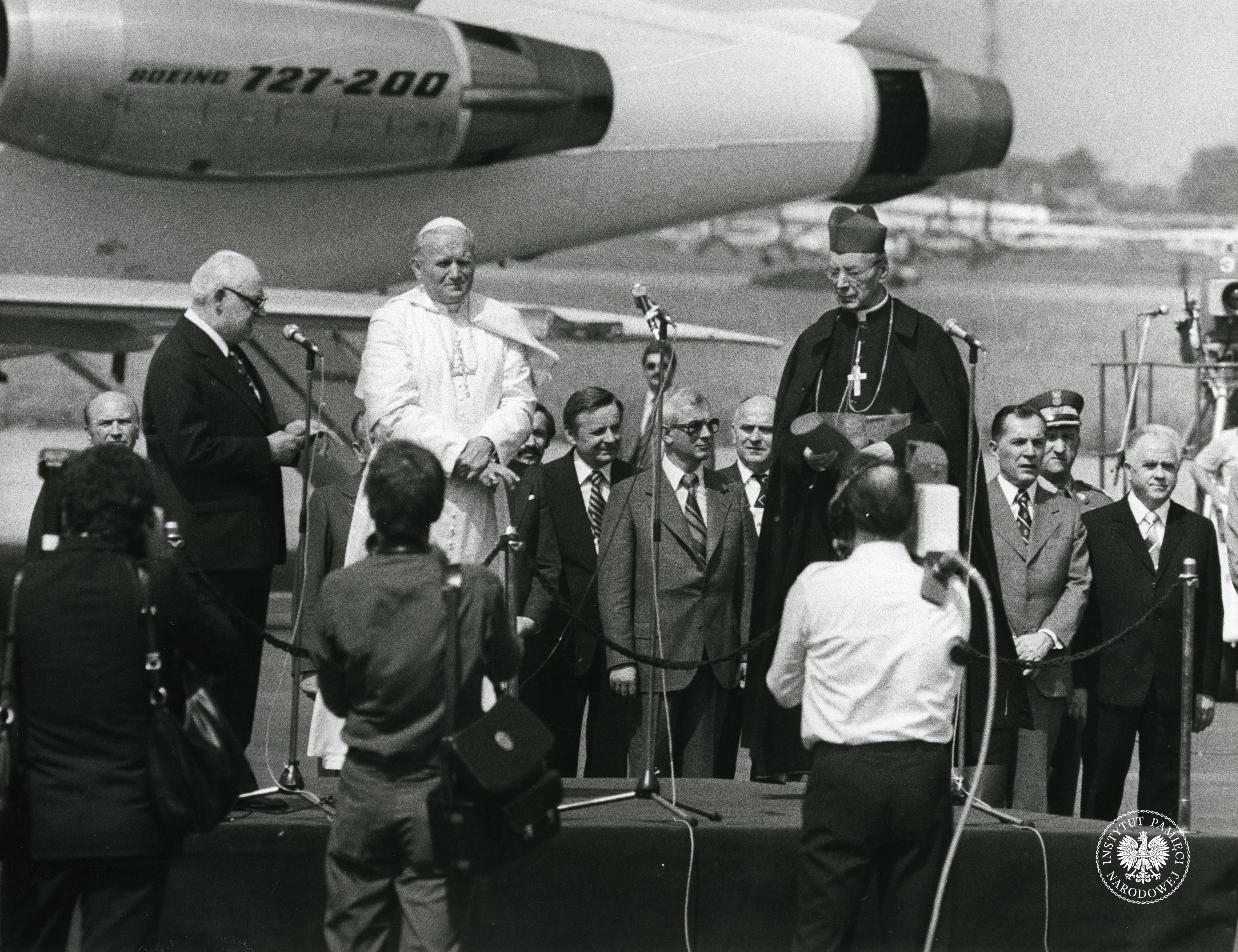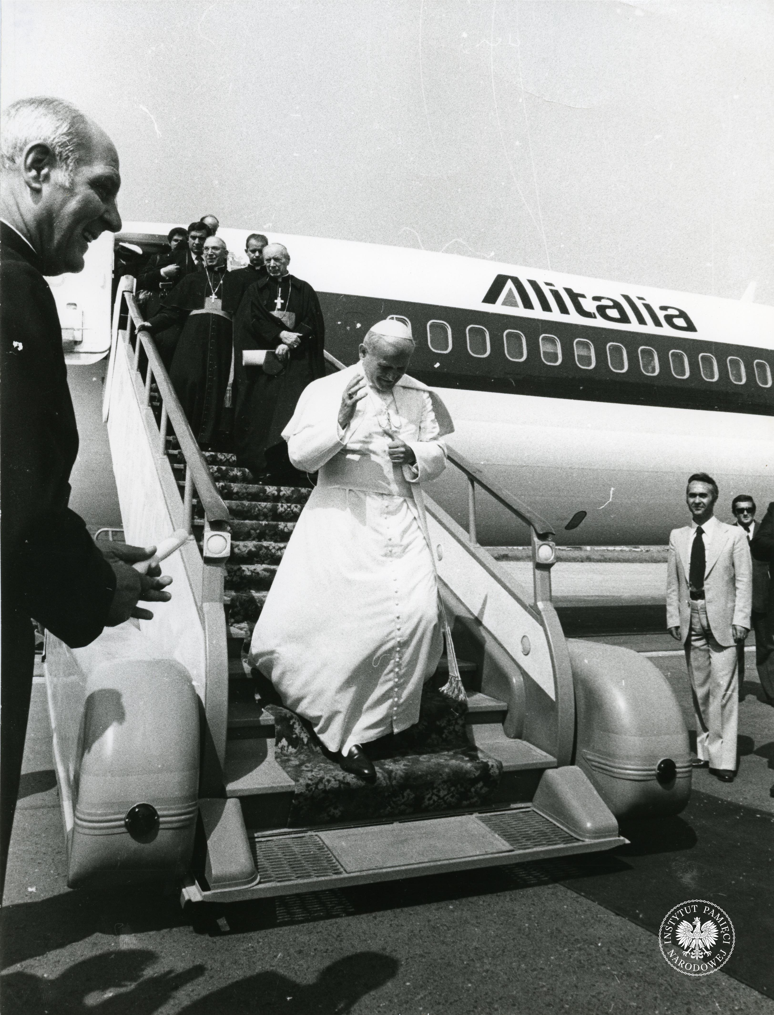 Pielgrzymka Jana Pawła II w 1979 r. do Polski. Jan Paweł II schodzi po schodach samolotu włoskich linii lotniczych Alitalia na lotnisku w Warszawie, za papieżem kard. Stefan Wyszyński, z zasobu AIPN, sygn. IPNPo-7-7-1-118-1 -