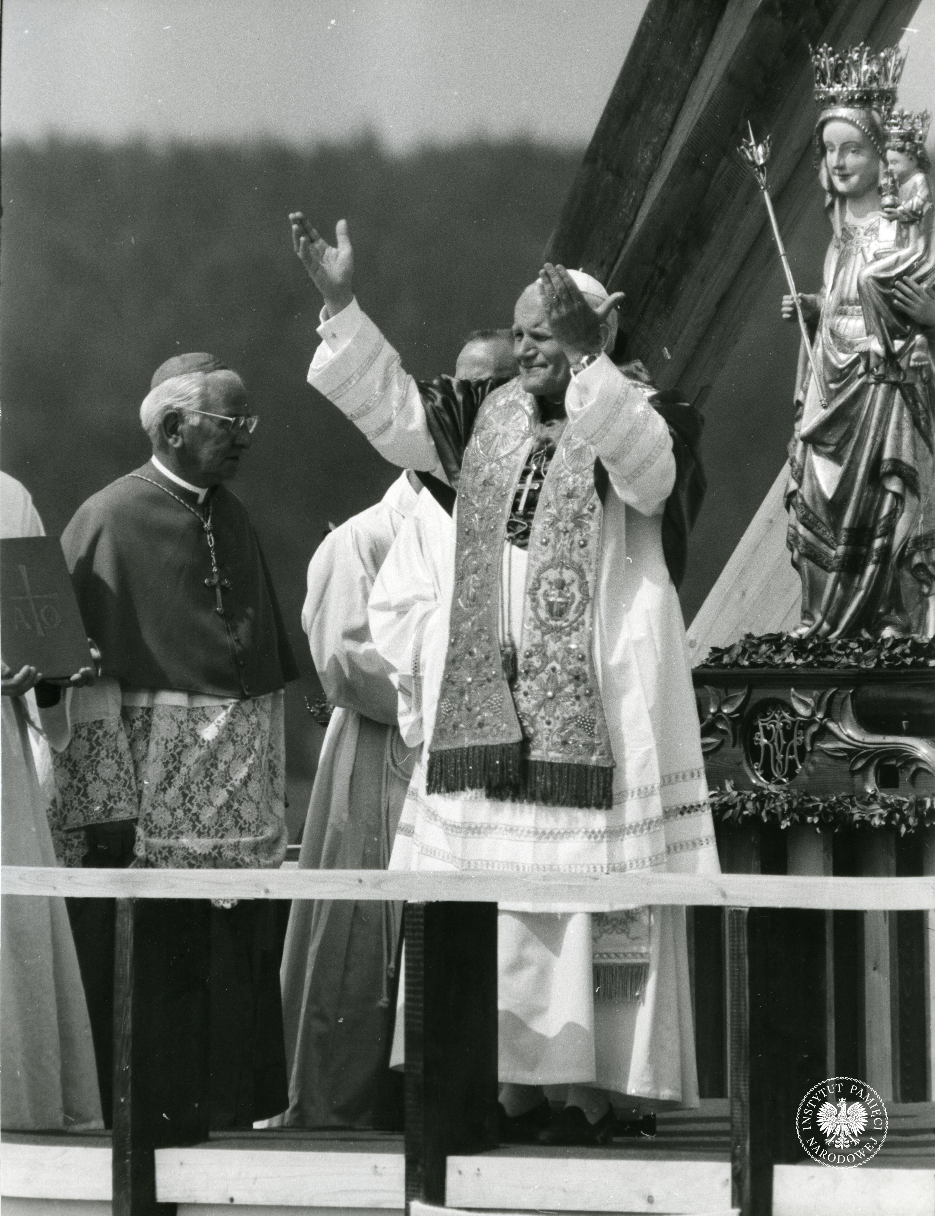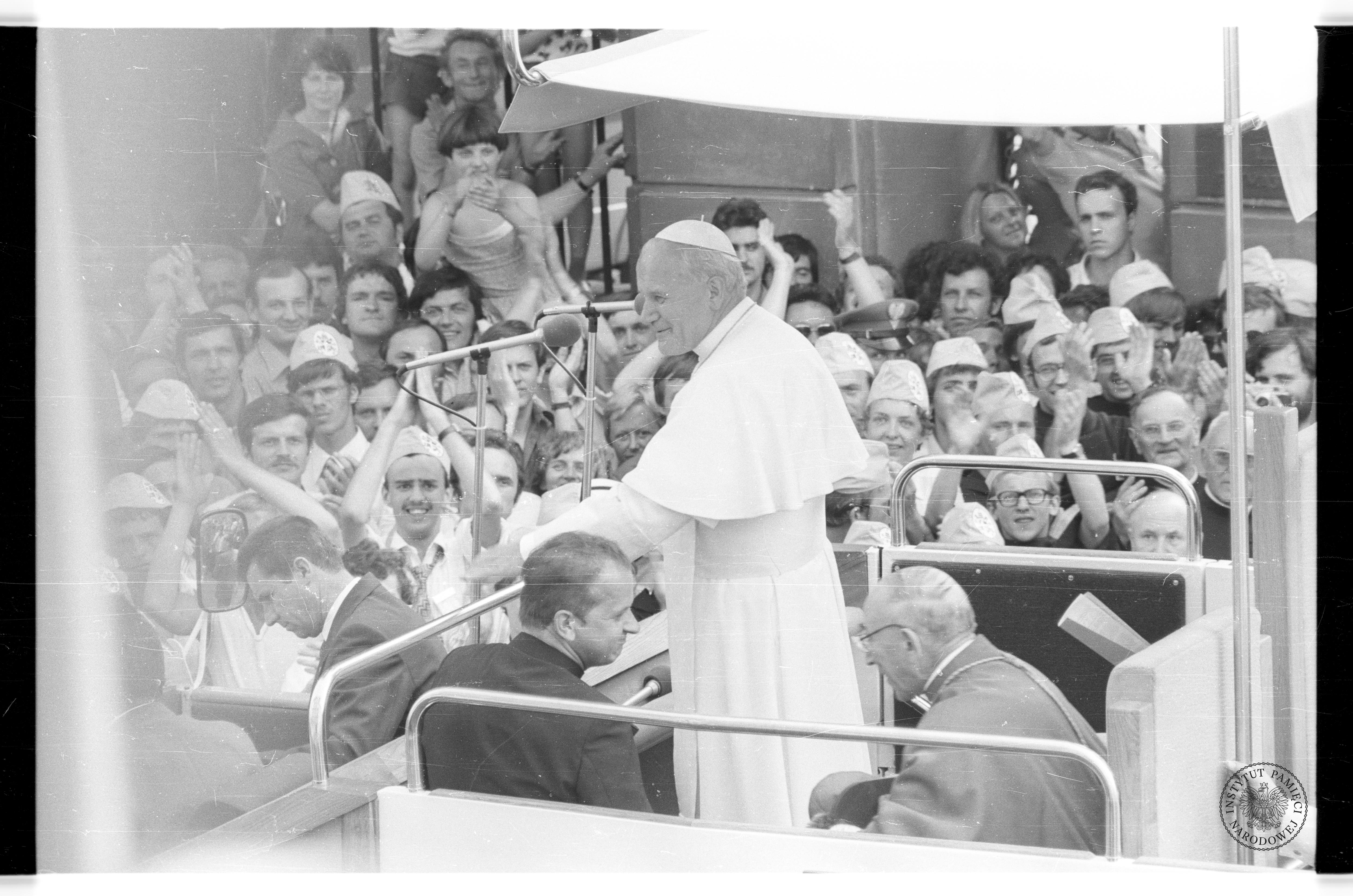 Sanktuarium Matki Bożej Częstochowskiej na Jasnej Górze. Papież Jan Paweł II pozdrawia wiernych z podium ołtarza papieskiego, 4-6 czerwca 1979 r., z zasobu AIPN, sygn. IPNPo-7-7-1-46-1 -