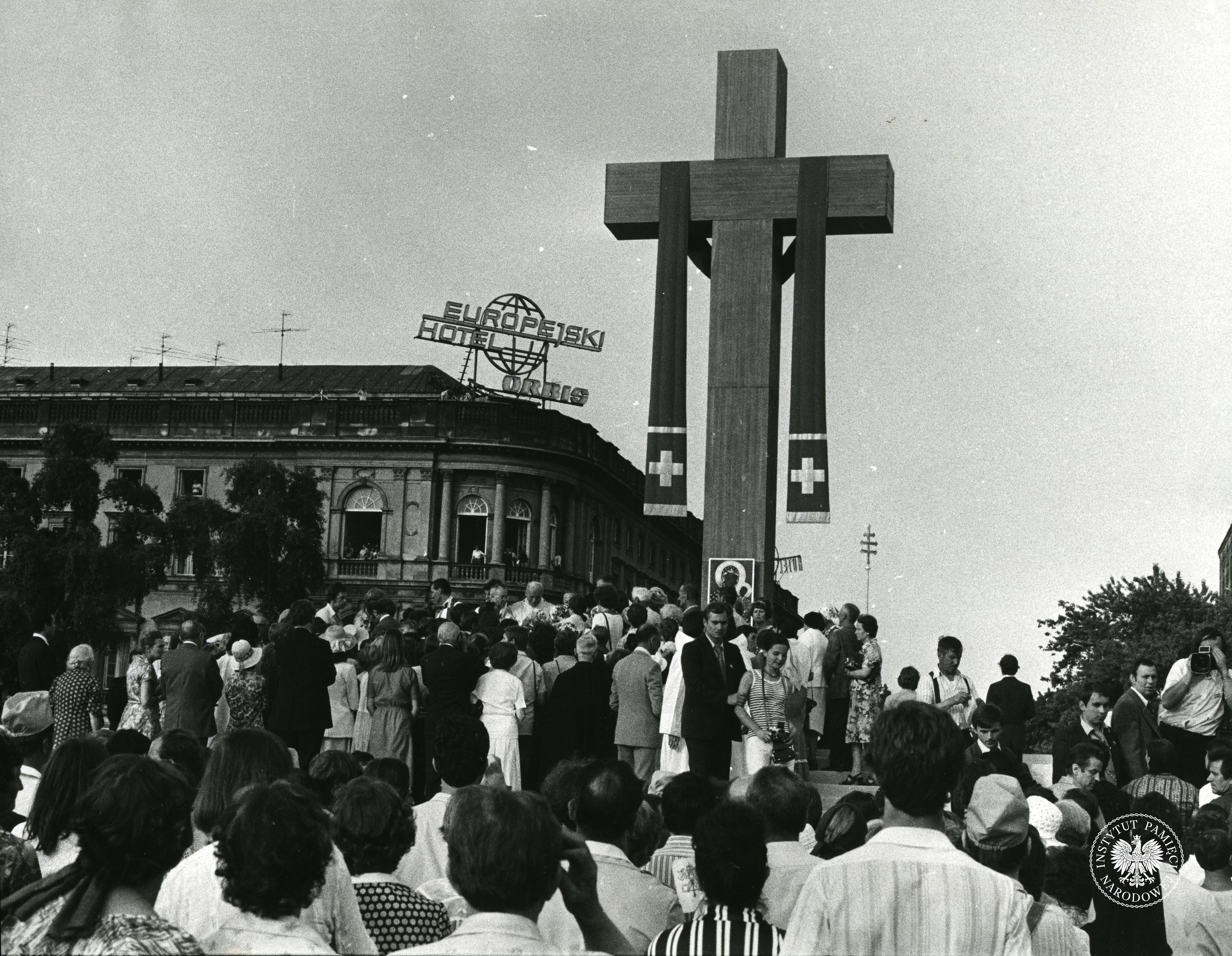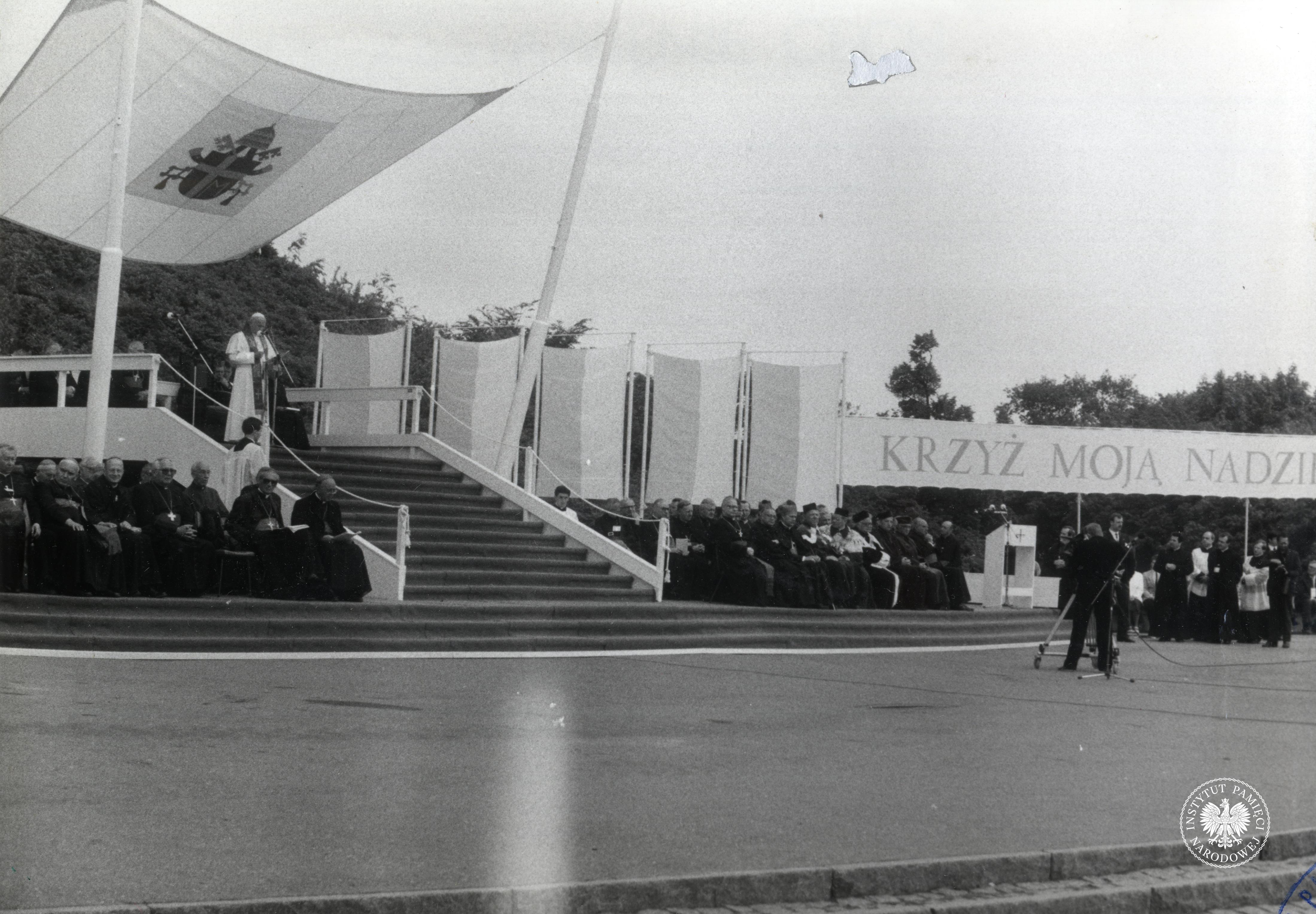 Trzecia pielgrzymka Jana Pawła II do Polski. Papież Jan Paweł II na Westerplatte w czasie wizyty w Polsce w 1987 r. Na transparencie napis: „Krzyż moją Nadzi[eją]”, 12 czerwca 1987 r., z zasobu AIPN, sygn. IPNGd-7-2-2-13-1 -