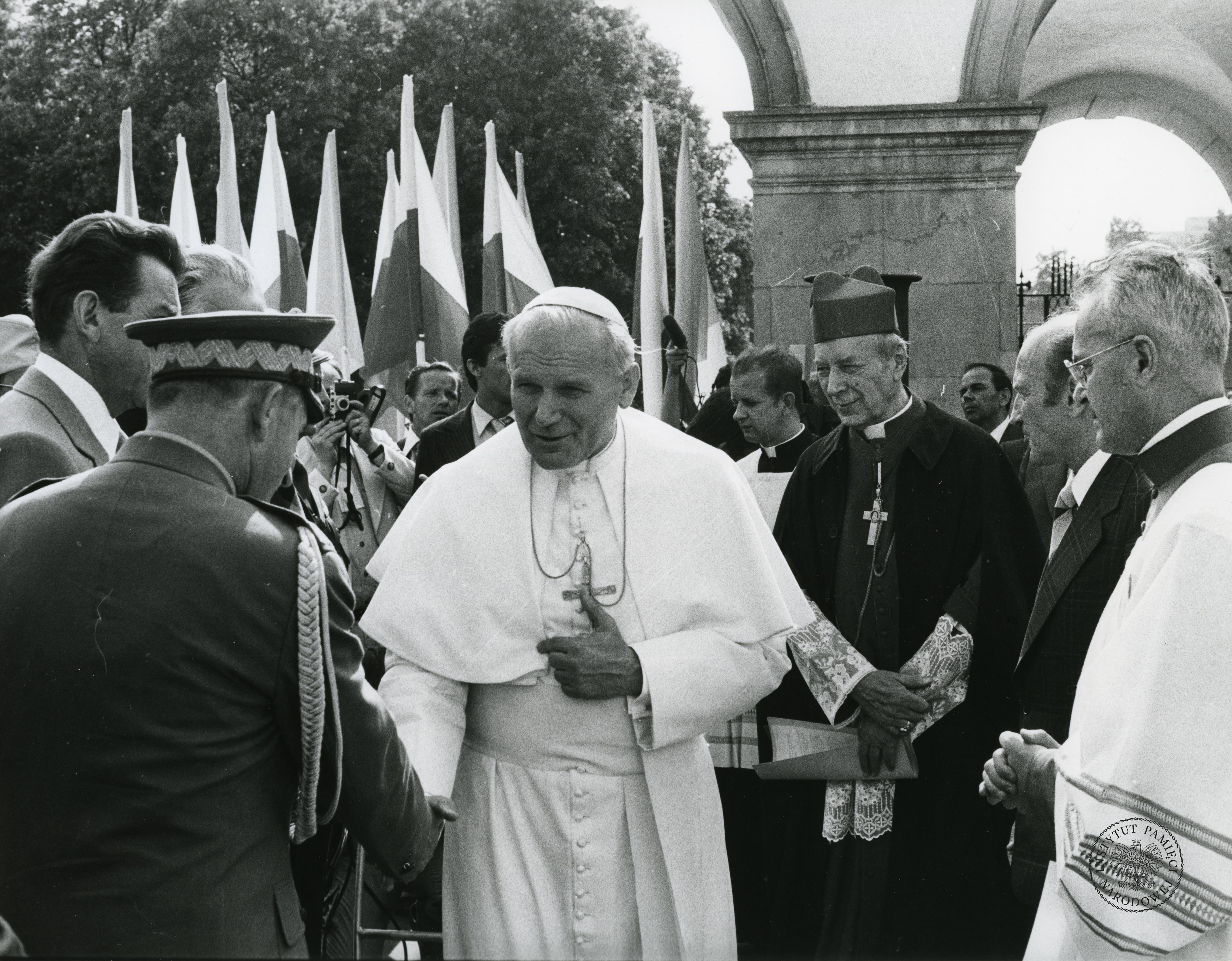 Papież Jan Paweł II wita się z delegacją przedstawicieli władz państwowych i wojskowych przy grobie Nieznanego Żołnierza w Warszawie. Za Papieżem stoi kard. Stefan Wyszyńsk, z zasobu AIPN, sygn. IPNPo-7-7-1-67-1 -