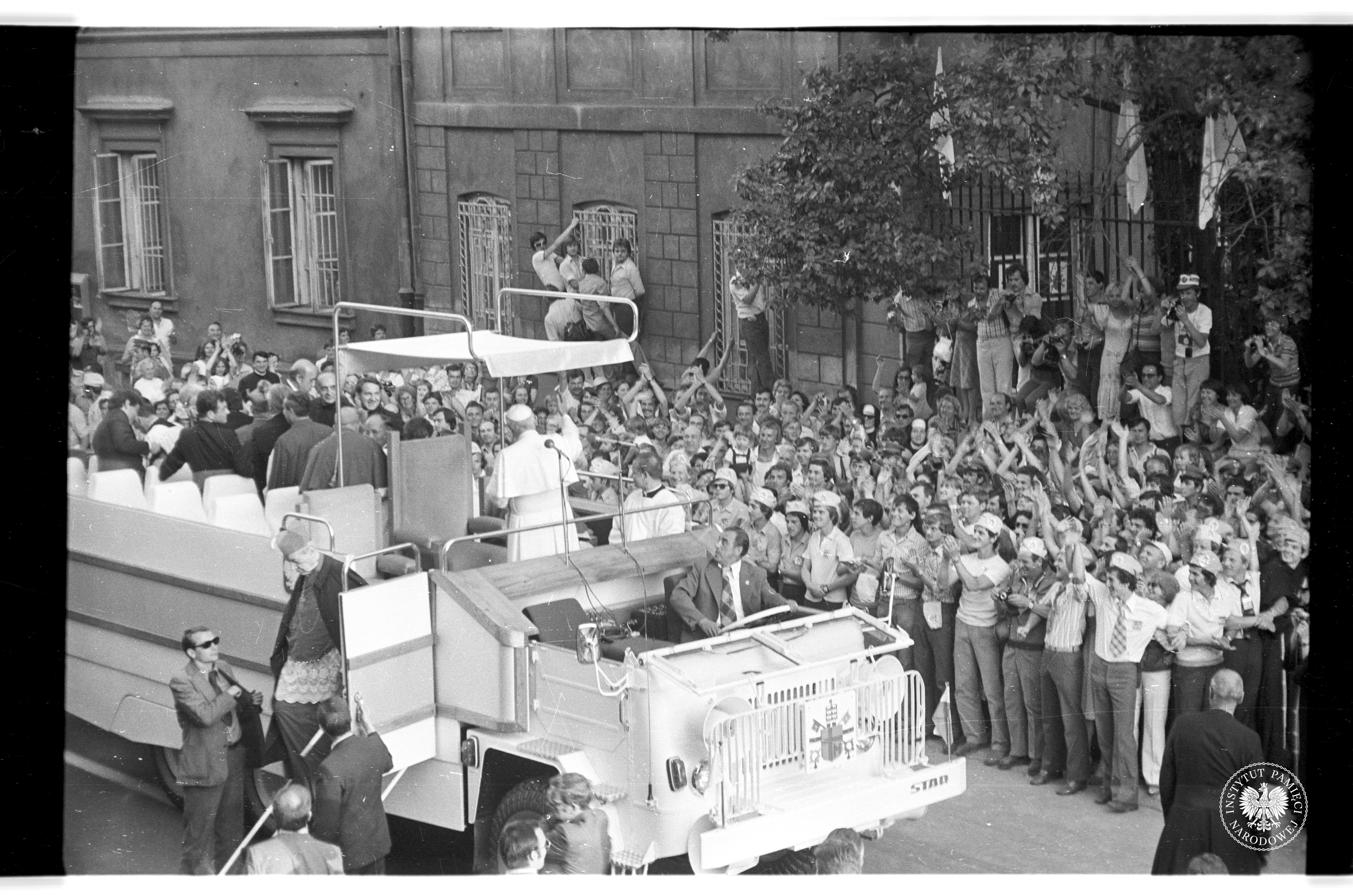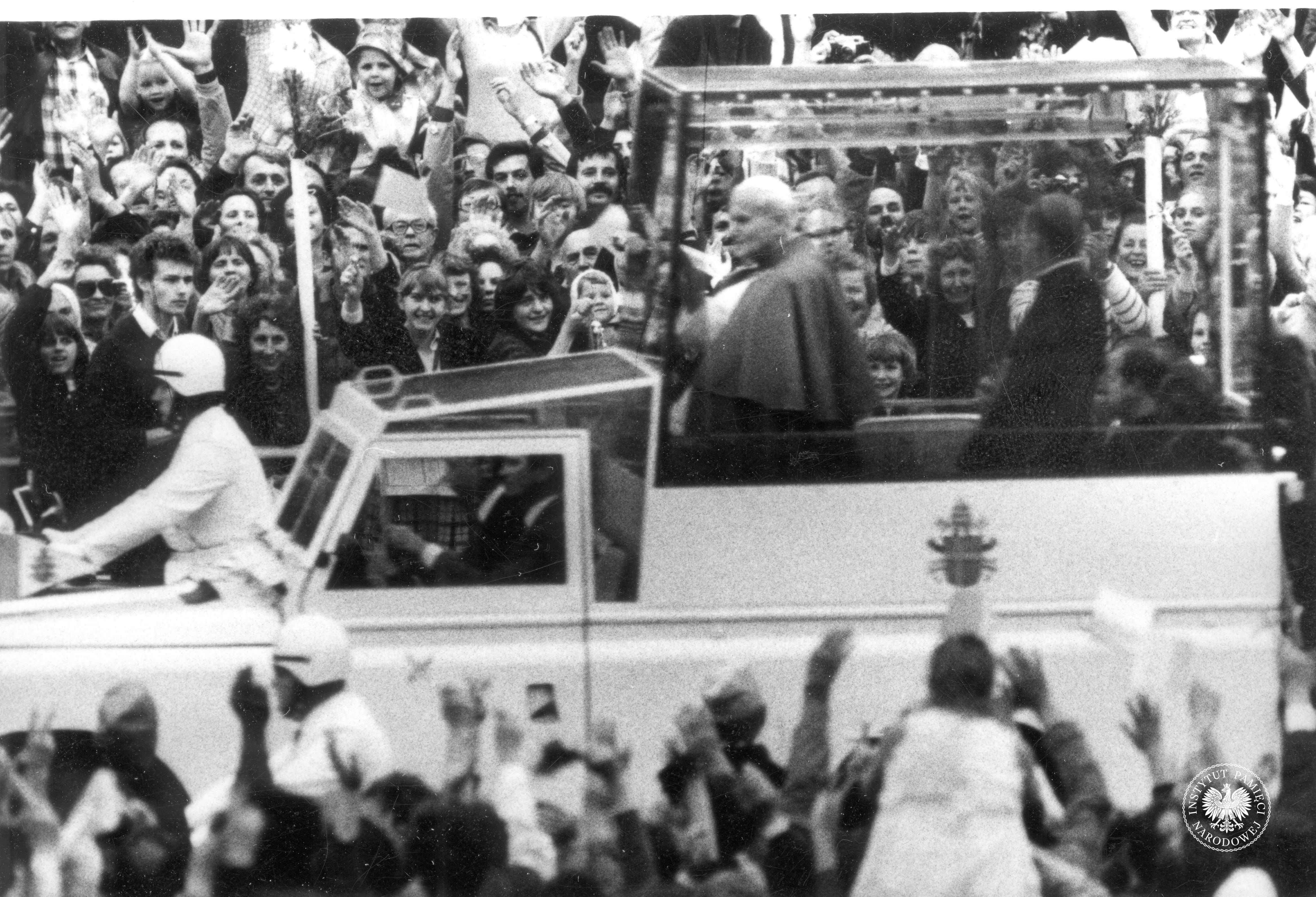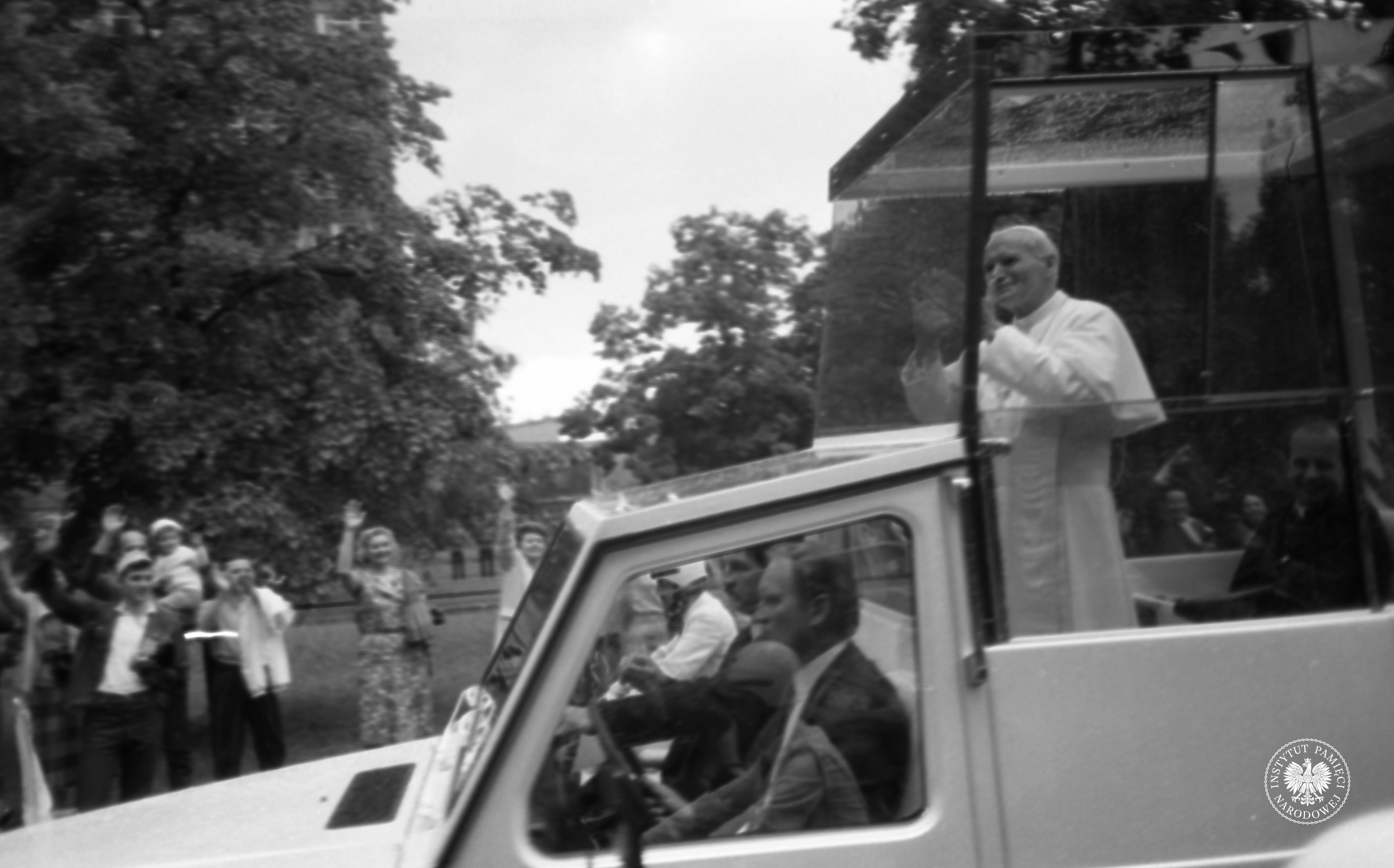 Pierwsza pielgrzymka Jana Pawła II do Polski. Papież Jan Paweł II w samochodzie papieskim, którym poruszał się wśród wiernych, 3 czerwca 1979 r., z zasobu AIPN, sygn. IPNPo-7-7-1-23-1