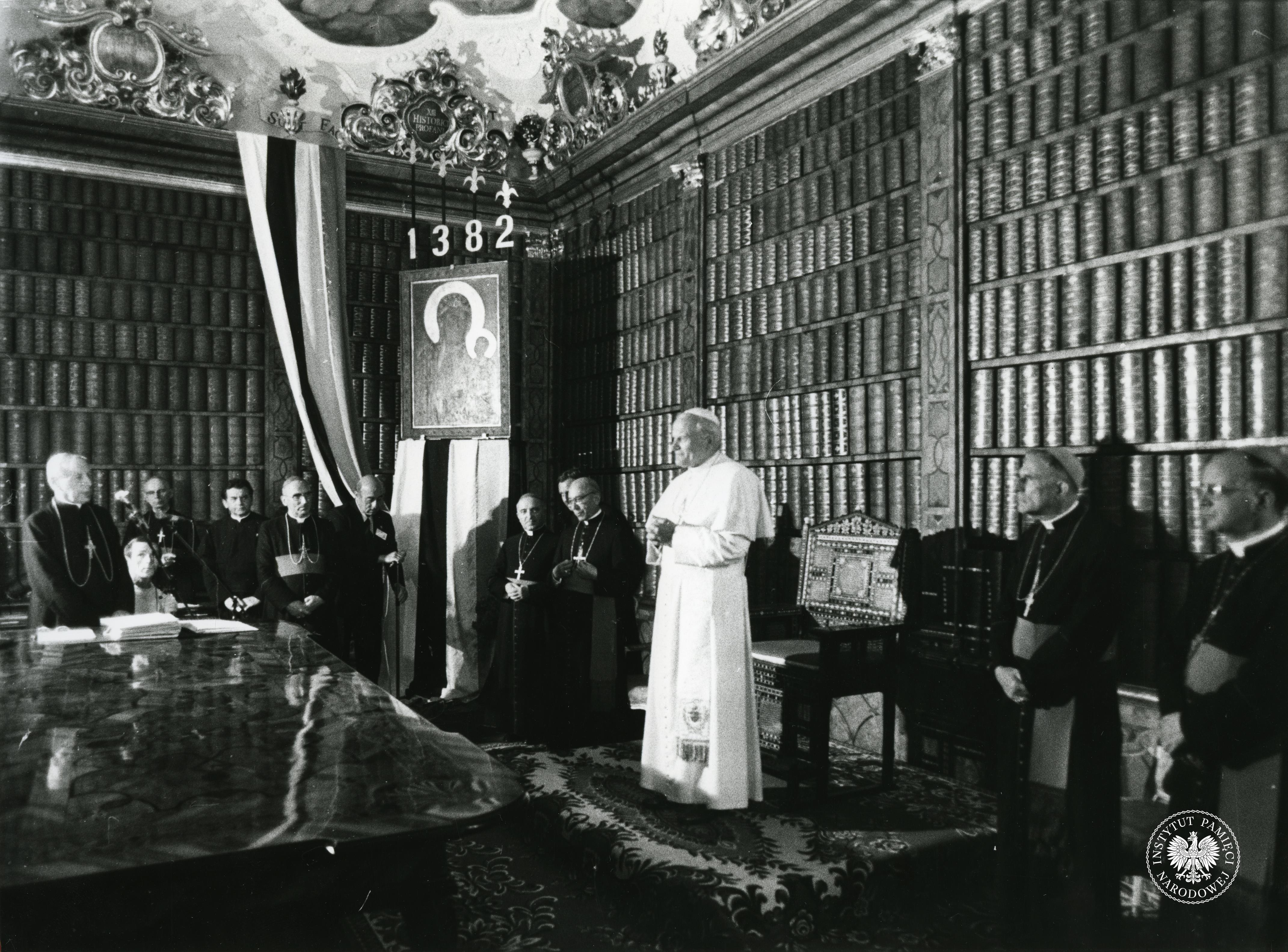 Fotografia przedstawia Konferencję Episkopatu Polski z udziałem Jana Pawła II w sali biblioteki klasztoru OO. Paulinów na Jasnej Górze., 4-6 czerwca 1979 r., z zasobu AIPN, sygn. IPNPo-7-7-1-49-1 -