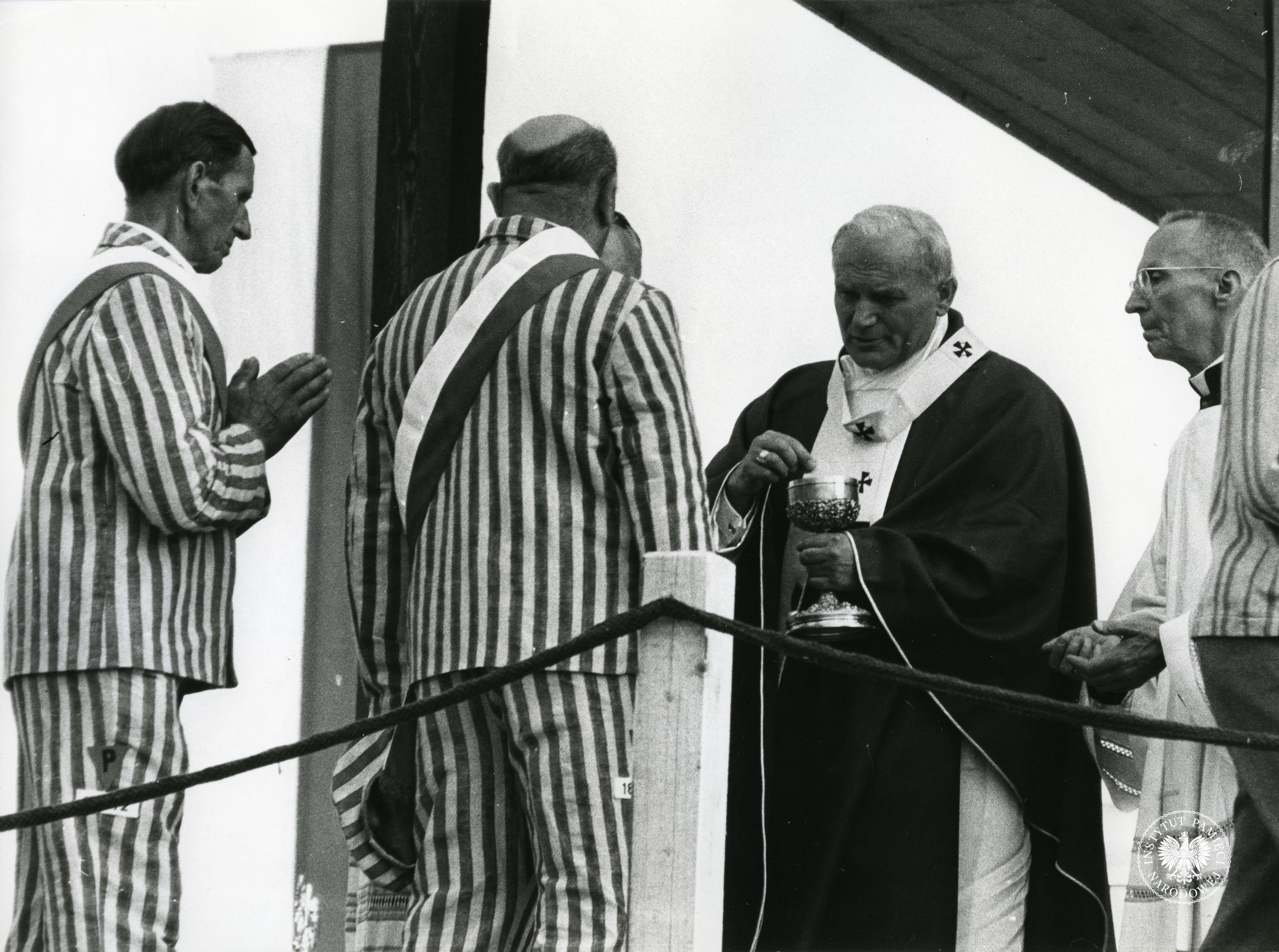 Ojciec Święty Jan Paweł II rozdaje Komunię św. byłym więźniom niemieckich obozów koncentracyjnych podczas Mszy św. odprawianej przy ołtarzu polowym wzniesionym na rampie kolejowej na terenie byłego niemieckiego obozu koncentracyjnego i zagłady Auschwitz-Birkenau w Brzezince. Obok Jana Pawła II stoi ceremoniarz papieski ksiądz Orazio Cocchetti, 7 czerwca 1979 r., z zasobu AIPN, sygn. IPNPo-7-7-1-97 -