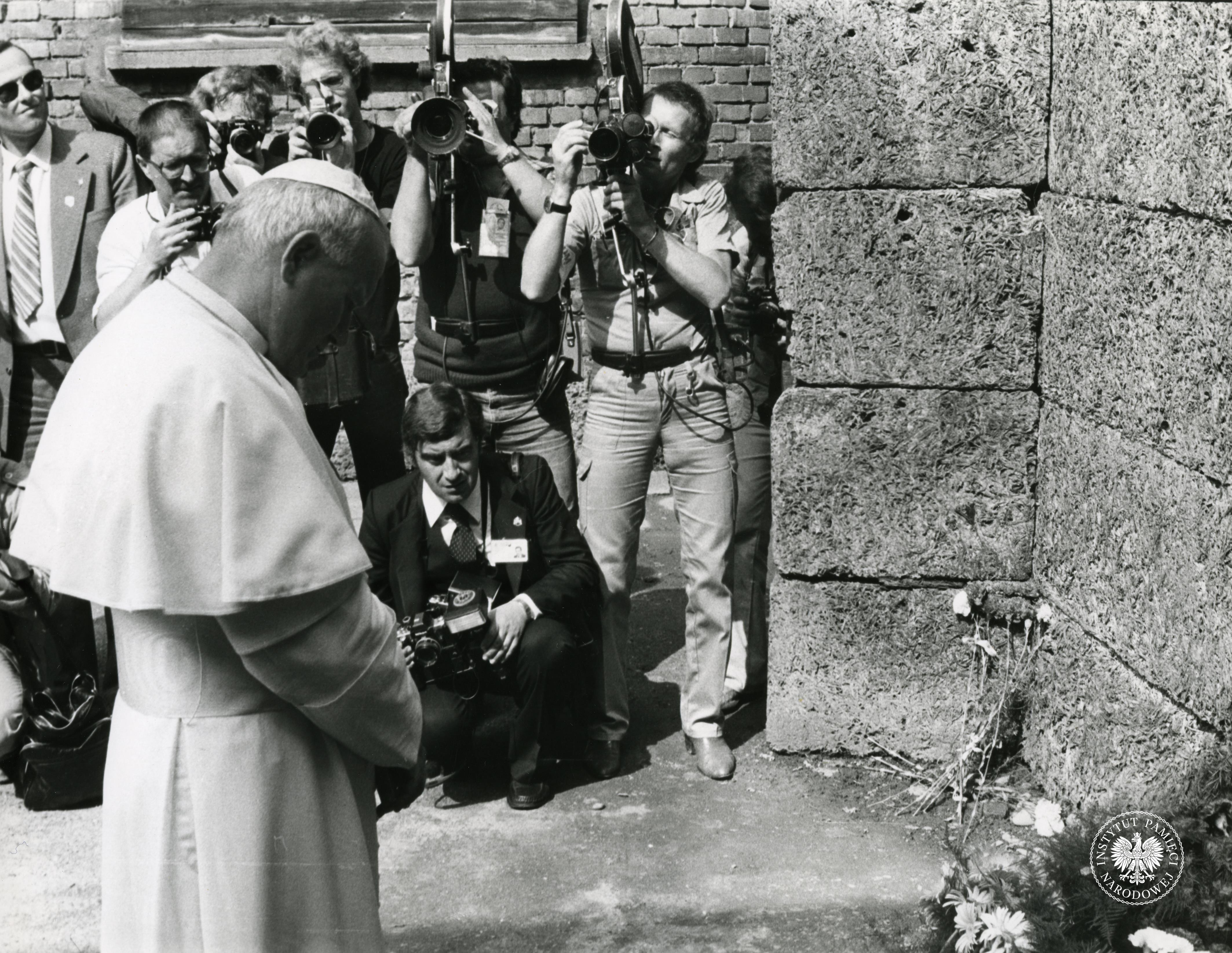 Papież Jan Paweł II modli się przed ścianą straceń znajdującą się na terenie byłego niemieckiego nazistowskiego obozu koncentracyjnego i zagłady Auschwitz-Birkenau w Oświęcimiu, z zasobu AIPN, sygn. IPNPo-7-7-1-41-1 -