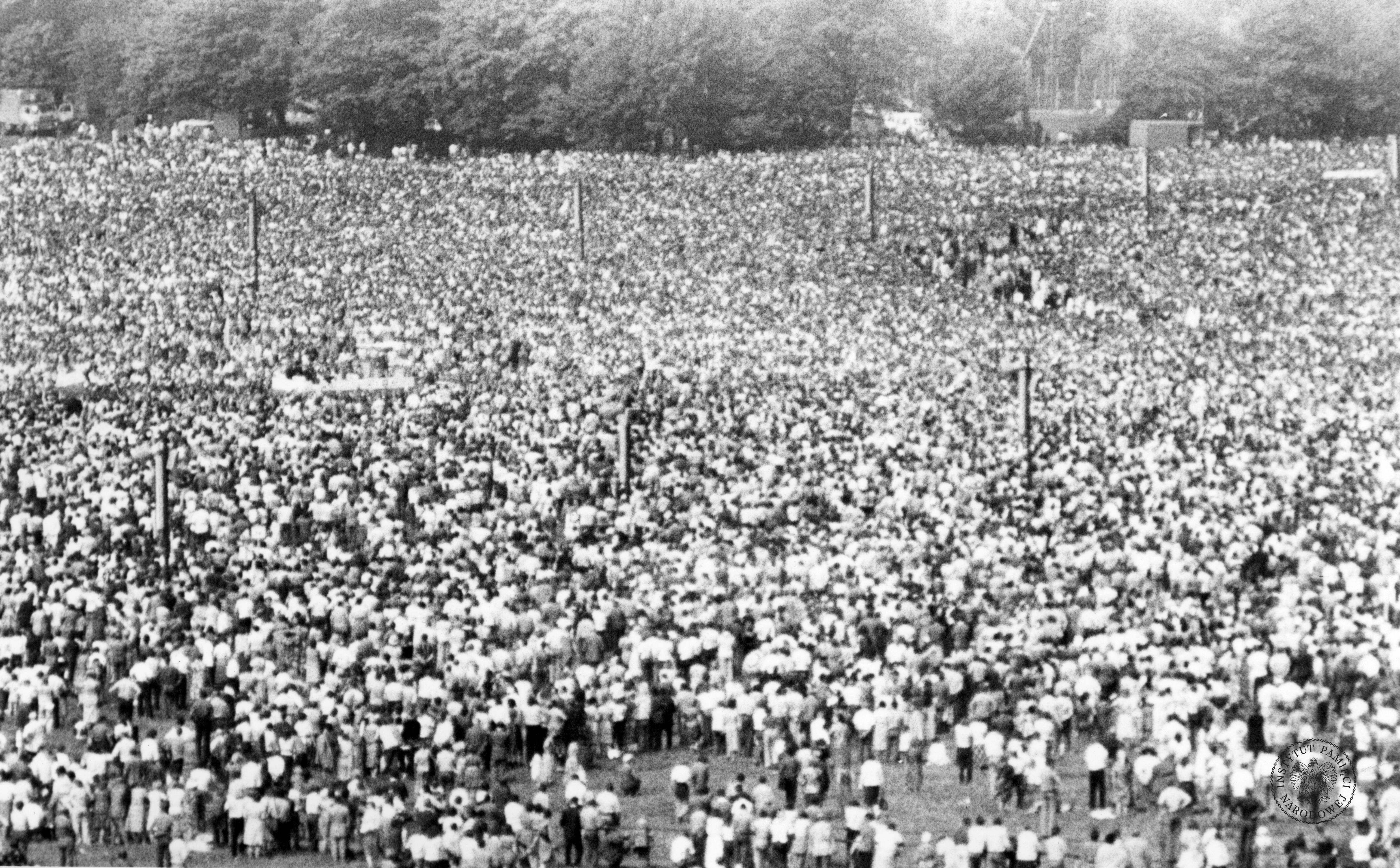 Tłum wiernych zgromadzony na krakowskich Błoniach, przed lub po Mszy świętej, celebrowanej przez papieża Jana Pawła II w ostatnim dniu jego pierwszej pielgrzymki do Ojczyzny, 10 czerwca 1979 r., z zasobu AIPN, sygn. IPNKr-7-7-1-609-1 -