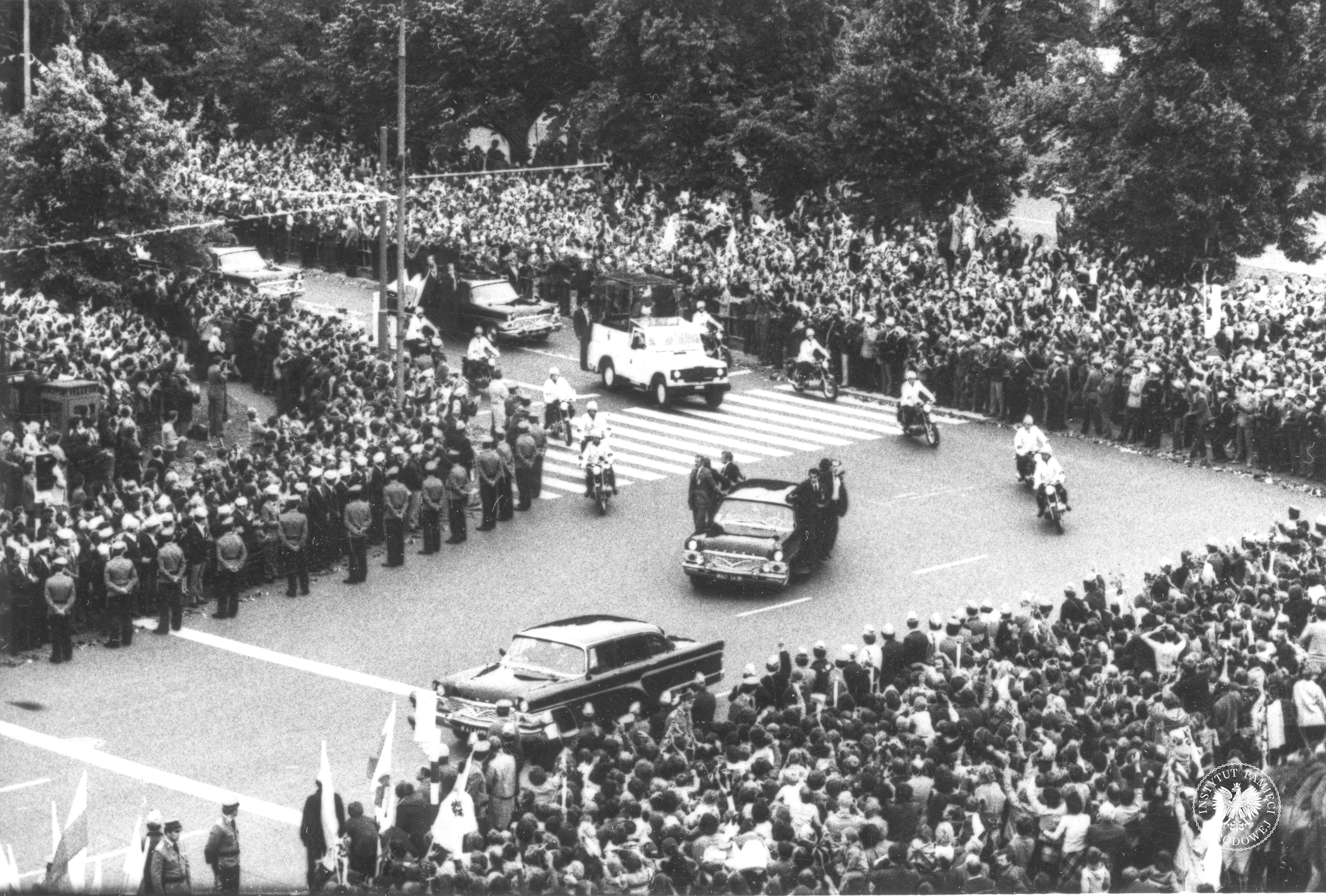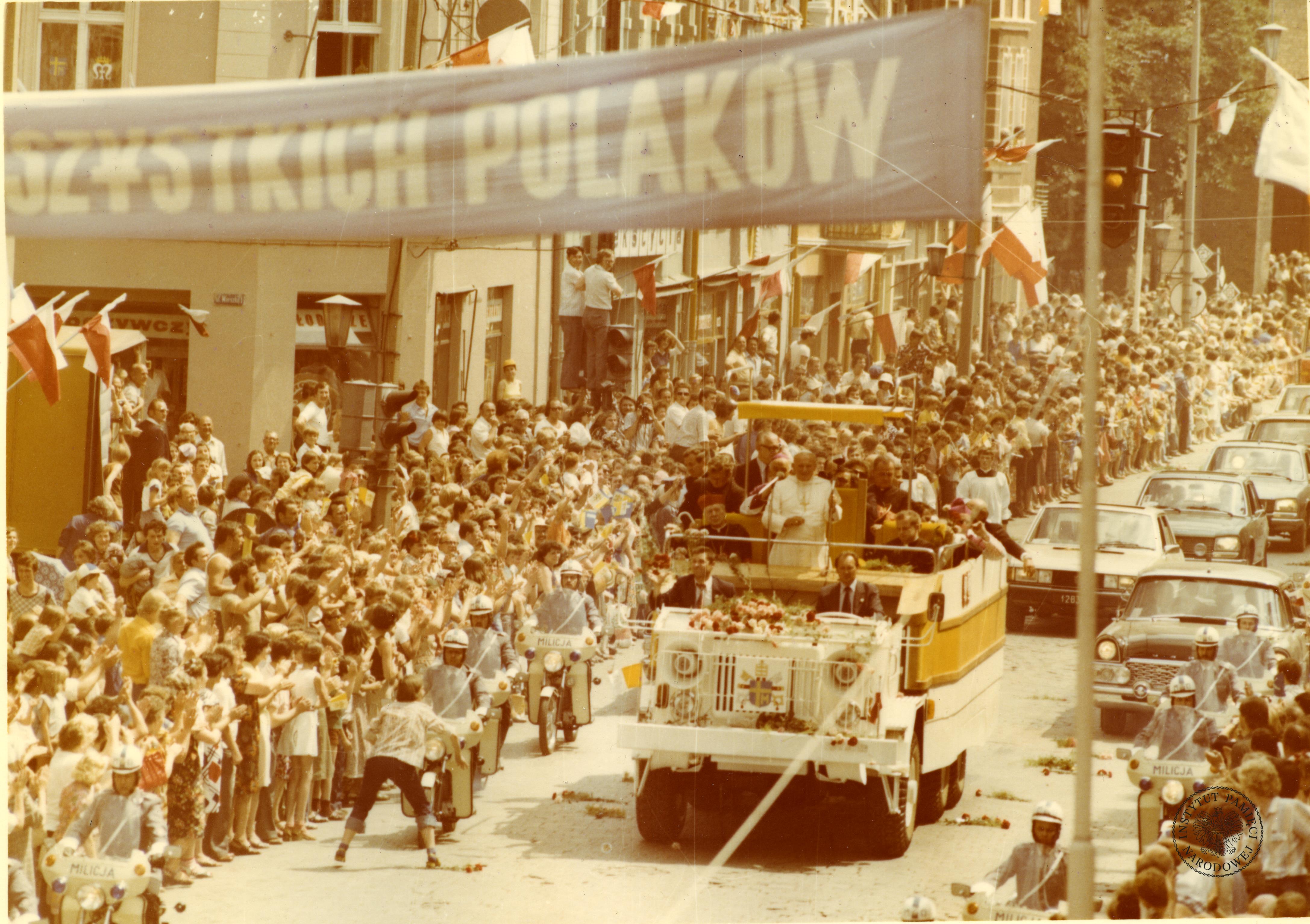 Pierwsza pielgrzymka Jana Pawła II do Polski. Przejazd Papieża Jana Pawła II ulicami Gniezna, 3 czerwca 1979 r., z zasobu AIPN, sygn. IPNPo-7-7-1-7-1 -