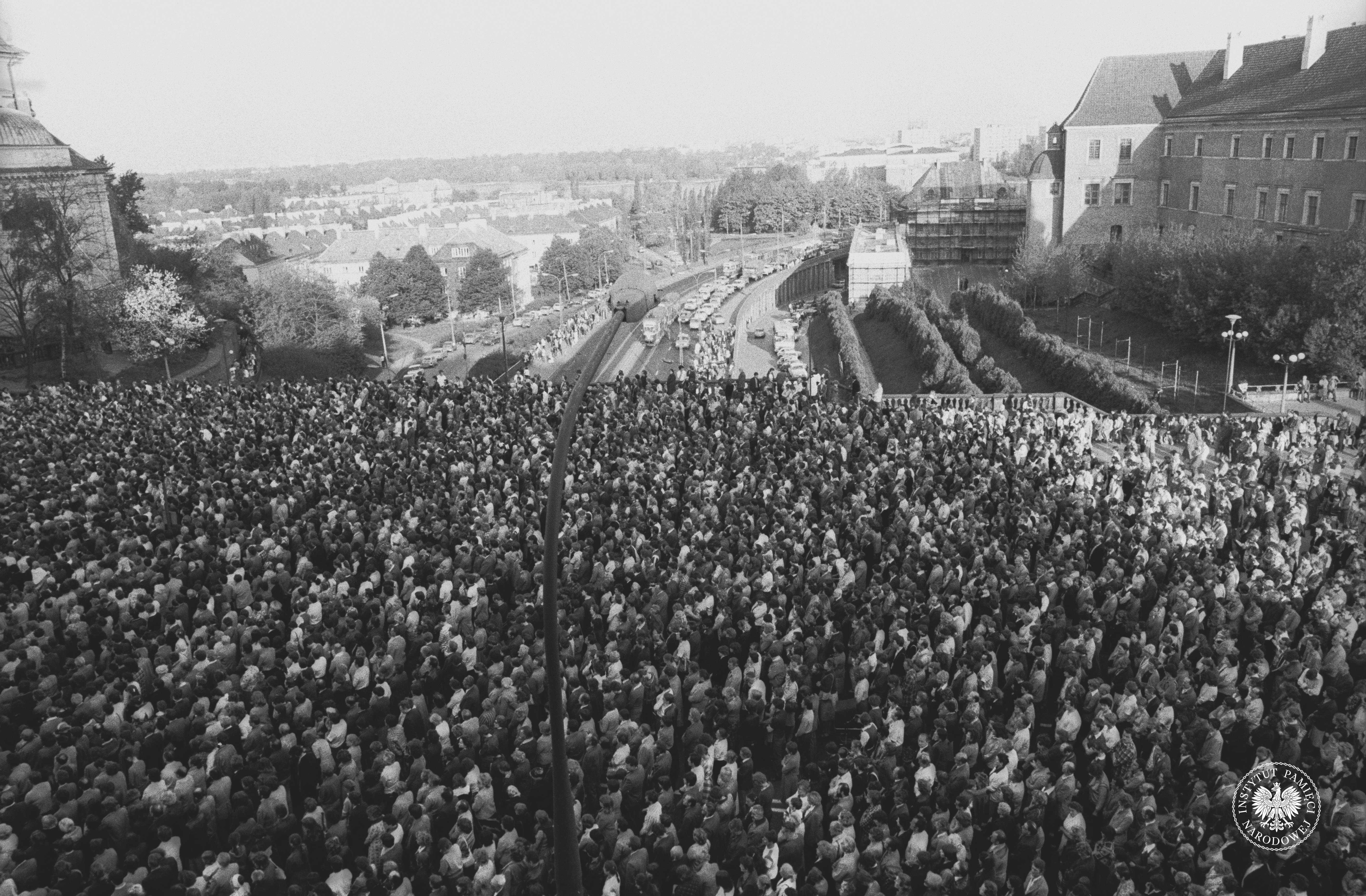 Ludzie zebrani na placu Zamkowym w Warszawie po zamachu na papieża Jana Pawła II, maj 1981 r., z zasobu AIPN, sygn. IPNBU-10-5-39-122-1 -
