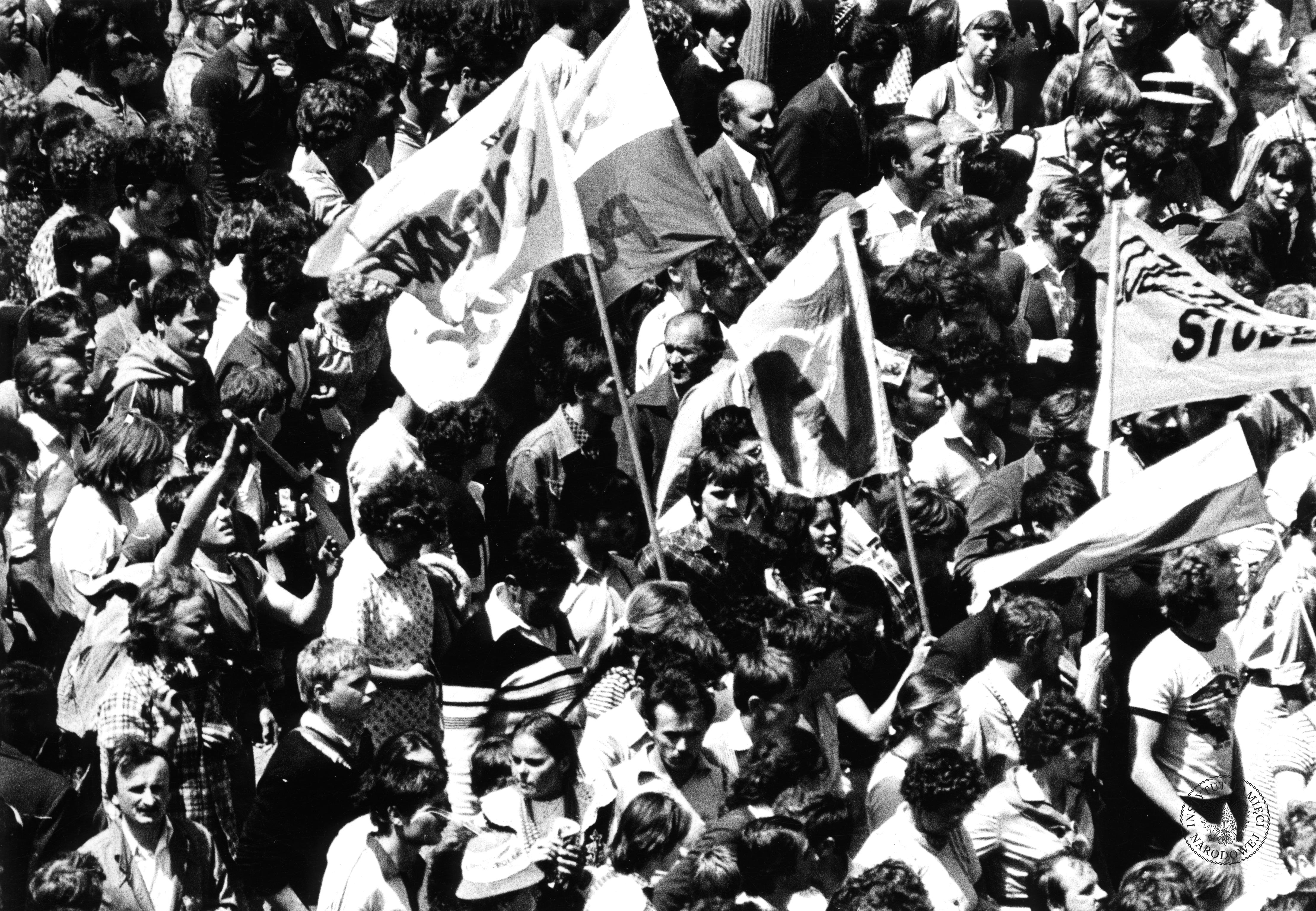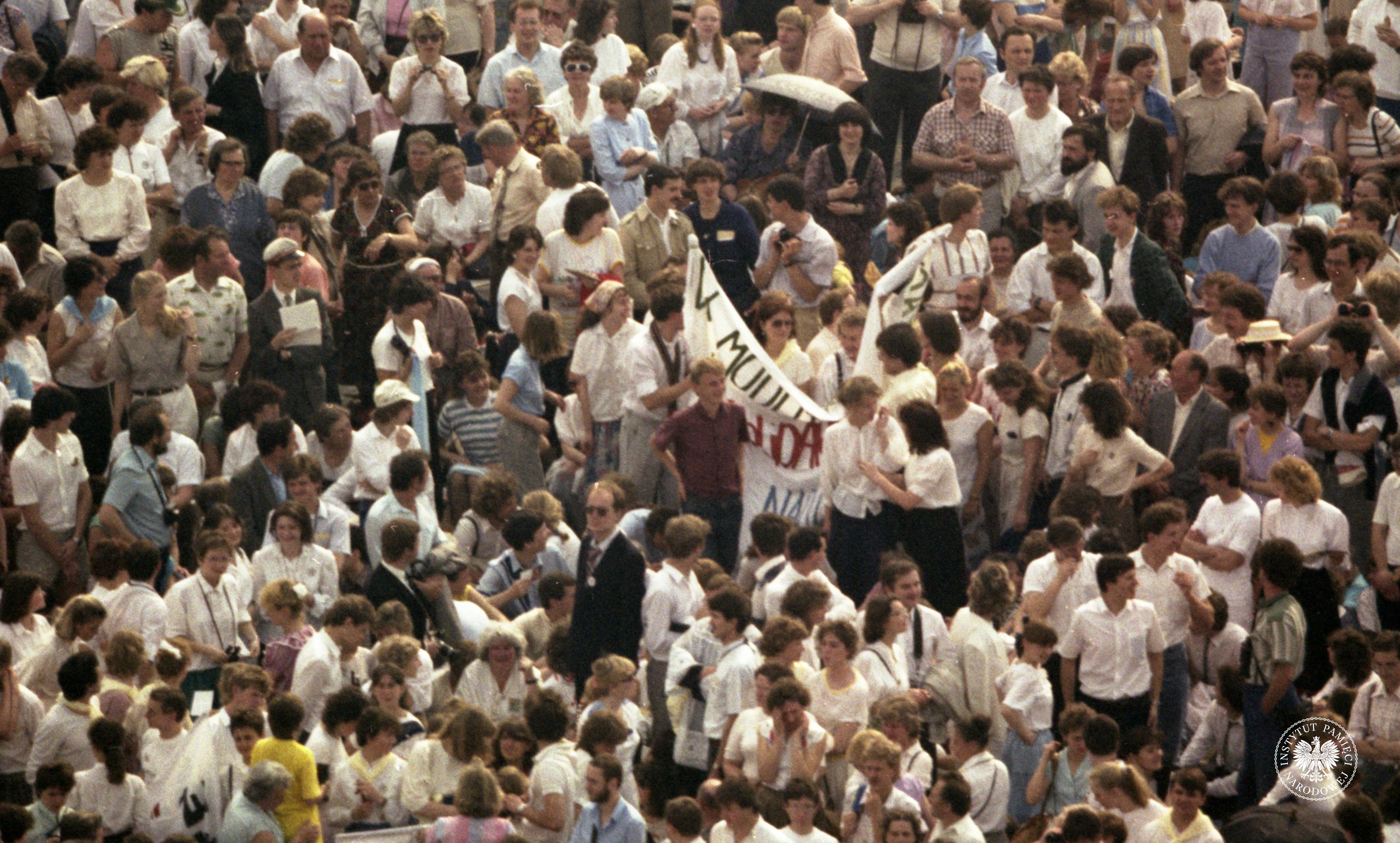 Trzecia pielgrzymka Jana Pawła II do Polski. Tłum pielgrzymów z transparentami na ulicach Warszawy. Obserwacja operacyjna w ramach operacji Zorza II prowadzona na ulicach Warszawy w czasie trzeciej pielgrzymki papieża Jana Pawła II do Polski, z zasobu AIPN, sygn. IPNBU-11-5-10-23-1 -