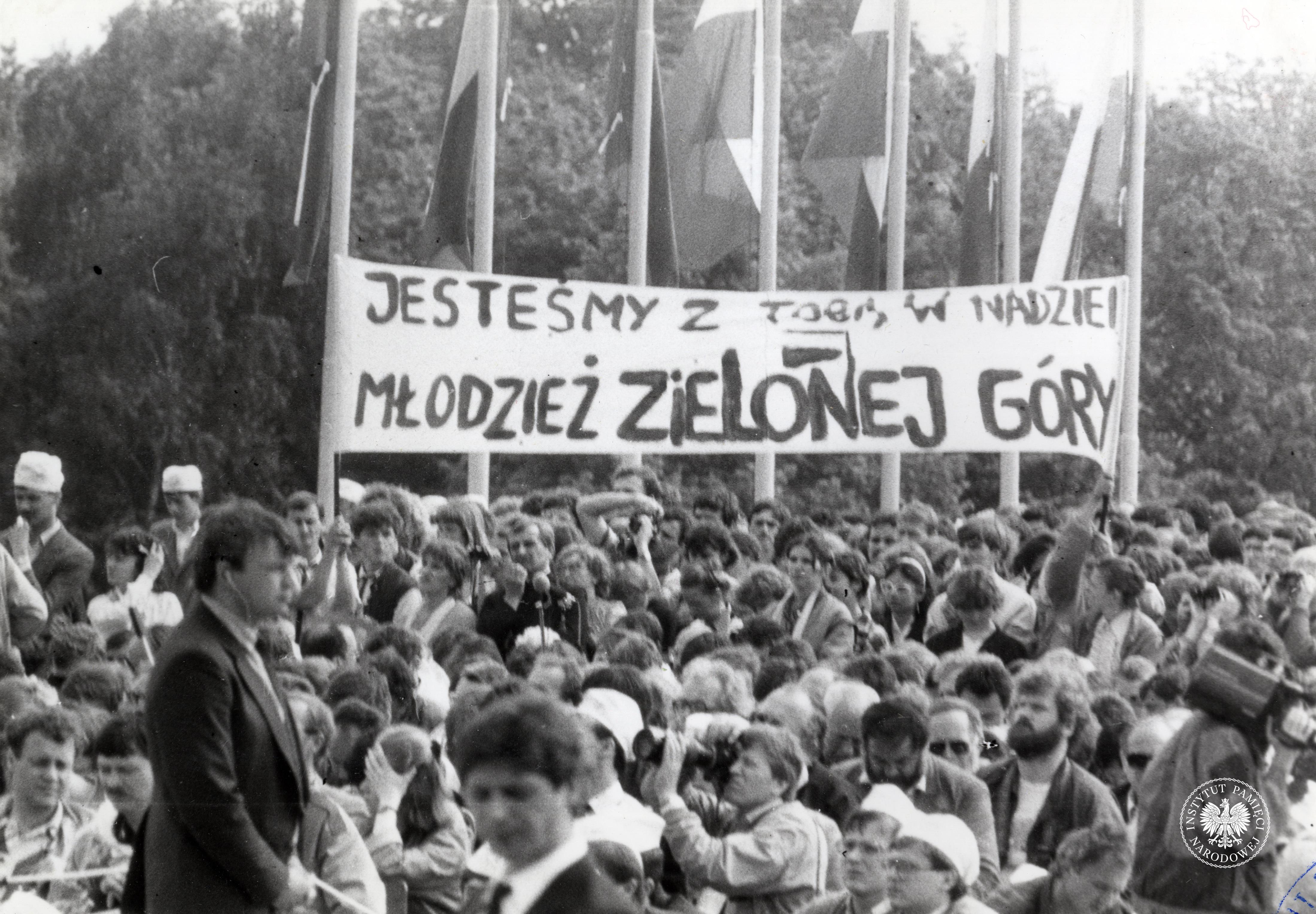Trzecia pielgrzymka Jana Pawła II do Polski. Ludzie zgromadzeni na Westerplatte podczas wizyty Jana Pawła II w Gdańsku w 1987 r. Na widocznych transparentach napis: „Jesteśmy z Tobą w nadziei / Młodzież Zielonej Góry”, z zasobu AIPN, sygn. IPNGd-7-2-2-17-1 -