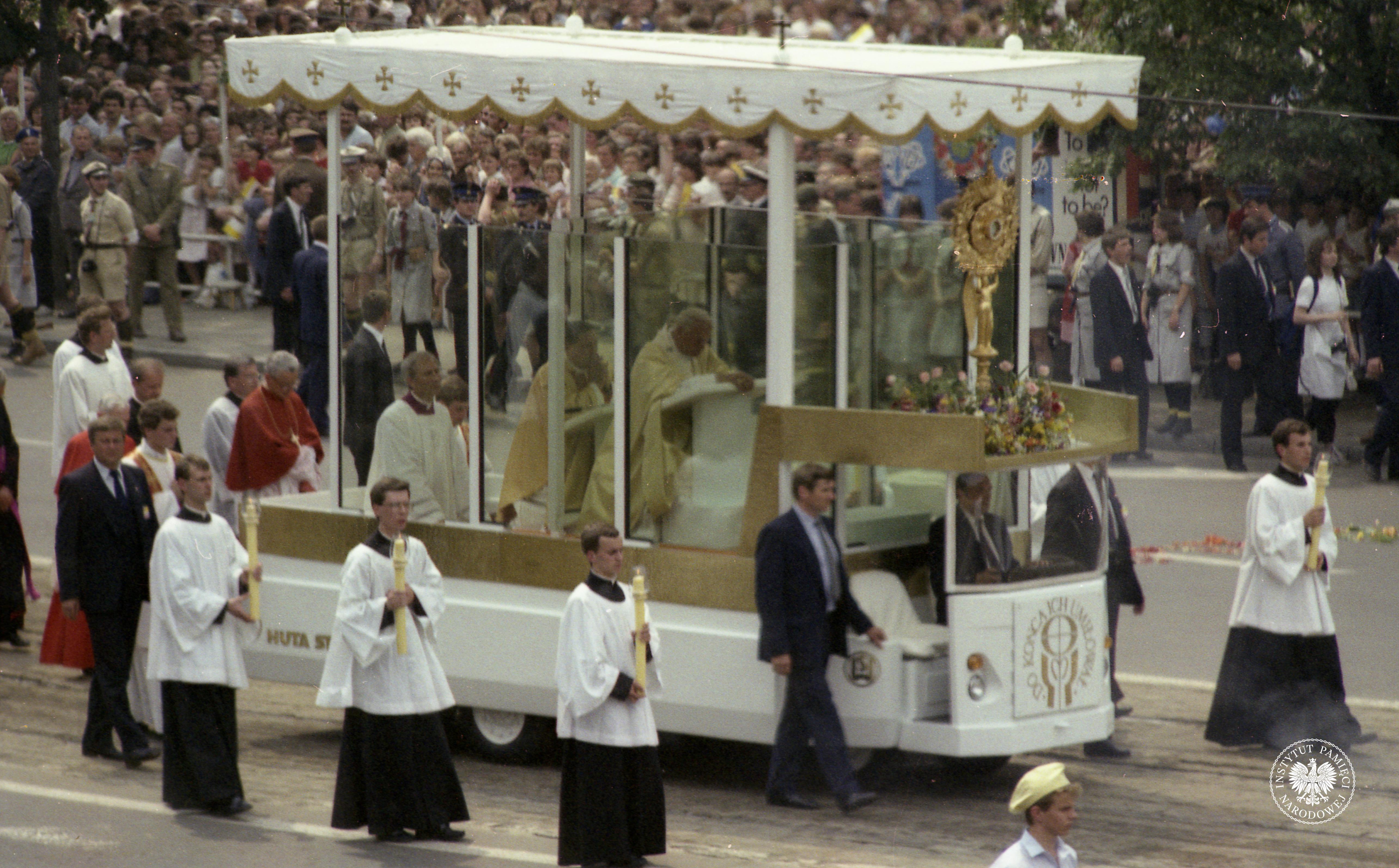 Trzecia pielgrzymka Jana Pawła II do Polski. Jan Paweł II klęczy w samochodzie przed monstrancją z Najświętszym Sakramentem, ul. Marszałkowska w Warszawie. Obserwacja operacyjna w ramach operacji Zorza II prowadzona na ulicach Warszawy w czasie trzeciej pielgrzymki papieża Jana Pawła II do Polski, z zasobu AIPN, sygn. IPNBU-11-5-10-576-1 -
