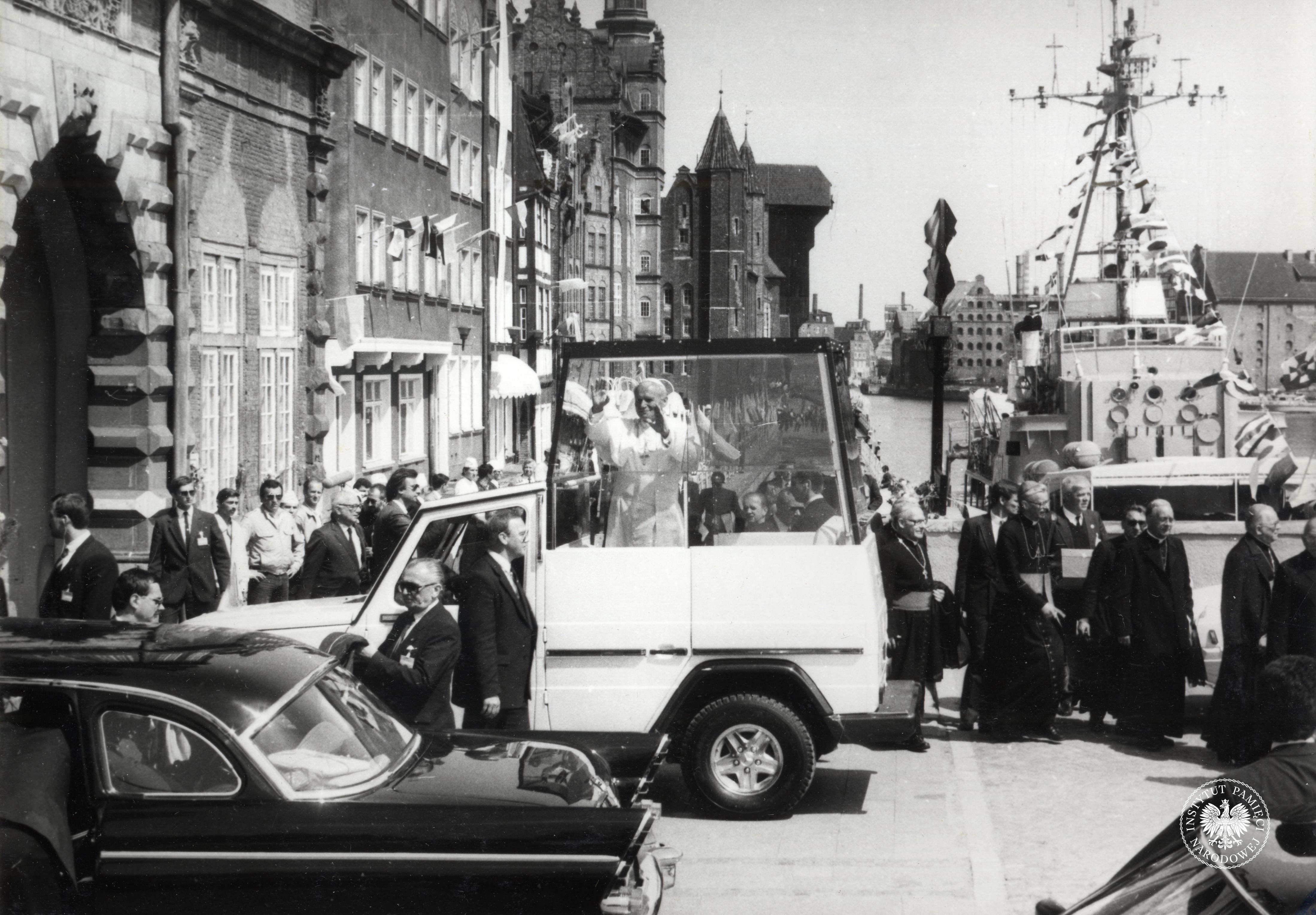 Trzecia pielgrzymka Jana Pawła II do Polski. Papież Jan Paweł II przy Zielonej Bramie w Gdańsku w czasie wizyty w 1987 r. W głębi Długie Pobrzeże, z zasobu AIPN, sygn. IPNGd-7-2-2-21-1