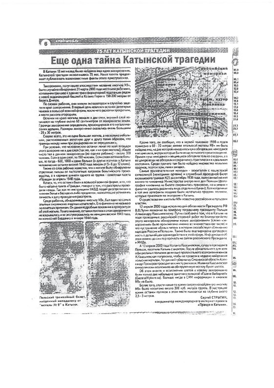 Dokumentem potwierdzającym odkrycie dołu śmierci ze szczątkami obywateli polskich jest pismo Prokuratury Obwodu Smoleńskiego z 5 lipca 2000 r., podpisane przez prokuratora A.P. Kowalowa oraz informacje zamieszczone w prasie polskiej i rosyjskiej, m.in. donoszące o rozmowie prezydenta Federacji Rosyjskiej, Władimira Putina z prezydentem Rzeczypospolitej Polskiej, Aleksandrem Kwaśniewskim.