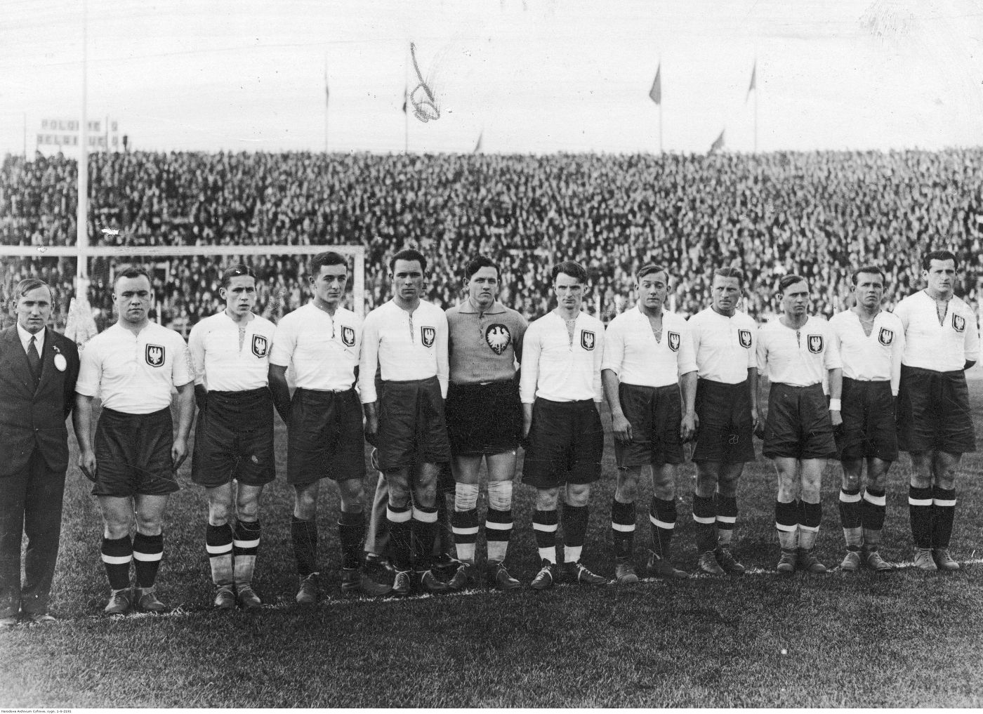 Mecz piłki nożnej Belgia-Polska w Brukseli. Drużyna Polski. Widoczni m.in.: kapitan Jerzy Bułanow (4. z prawej), Józef Kotlarczyk (2. z prawej), Franciszek Wilczkiewicz, Aleksander Mysiak (4. z lewej), Karol Kossok (1. z prawej), Karol Pazurek (5. z prawej), Witold Wypijewski, Józef Nawrot (7. z lewej), Marian Fontowicz (6. z lewej), Henryk Martyna (2. z lewej), Władysław Szczepaniak, trener Józef Kałuża (1. z lewej). 1931 r. Fot. NAC