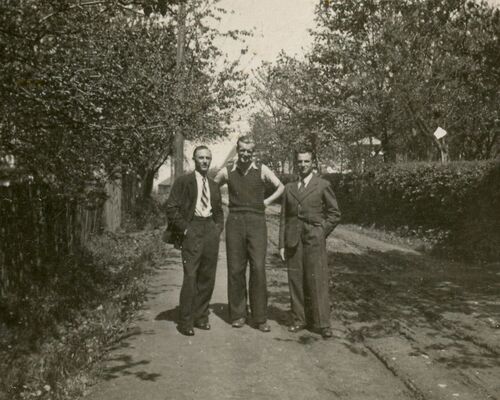 Żołnierze NOW-AK i NZW w okresie akcji ujawnieniowej, dowództwo Obwodu Wadowice. ogn. Stanisław Miarka „Sawa”, NN, ppor. Stefan Woszczyk „War” (Wadowice, ul. Karmelicka, październik 1945). Fot. ze zbiorów M. Siwca-Cielebona