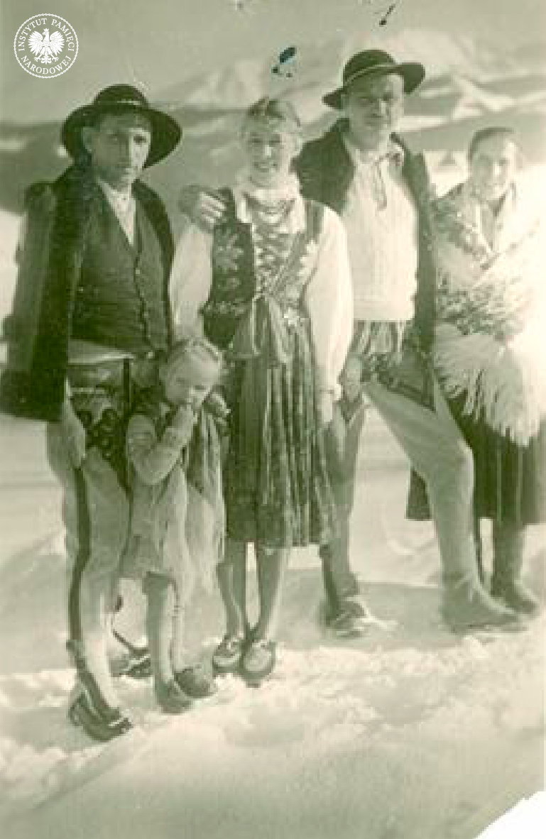 Na tle gór stoją od lewej: Jan Zwijacz, Zofia Zwijacz (dziecko), Lidia Lwow „Ewa – Lala” (oznaczona nr 2), mjr Zygmunt Szendzielarz „Łupaszka” (oznaczony nr 1), Maria Zwijacz (AIPN) -