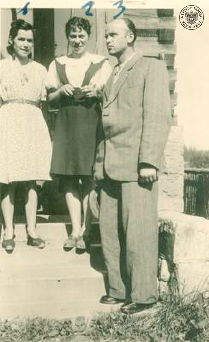 Stoją od lewej: Wanda Minkiewicz „Danka” (oznaczona nr 1), Lidia Lwow „Ewa – Lalka” (nr 2), mjr Zygmunt Szendzielarz „Łupaszka” (nr 3) (AIPN) -