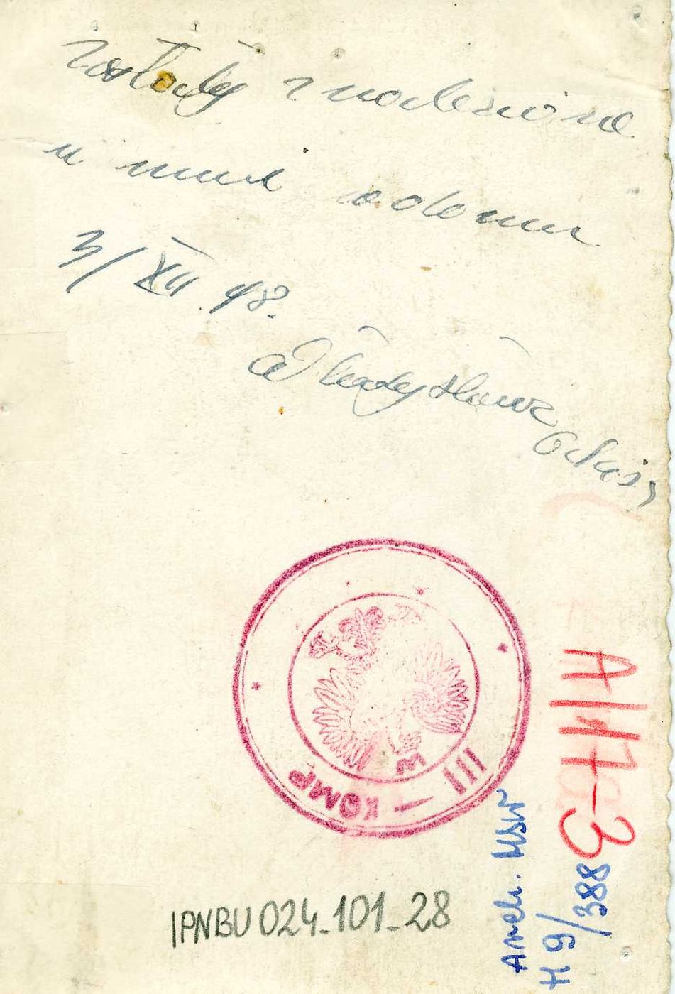 Rewers fotografii oddziału partyzanckiego „Wiarusy” z pieczęcią oddziału i adnotacją o jego odnalezieniu u Władysławy Orkisz, siostry Józefa (AIPN) -
