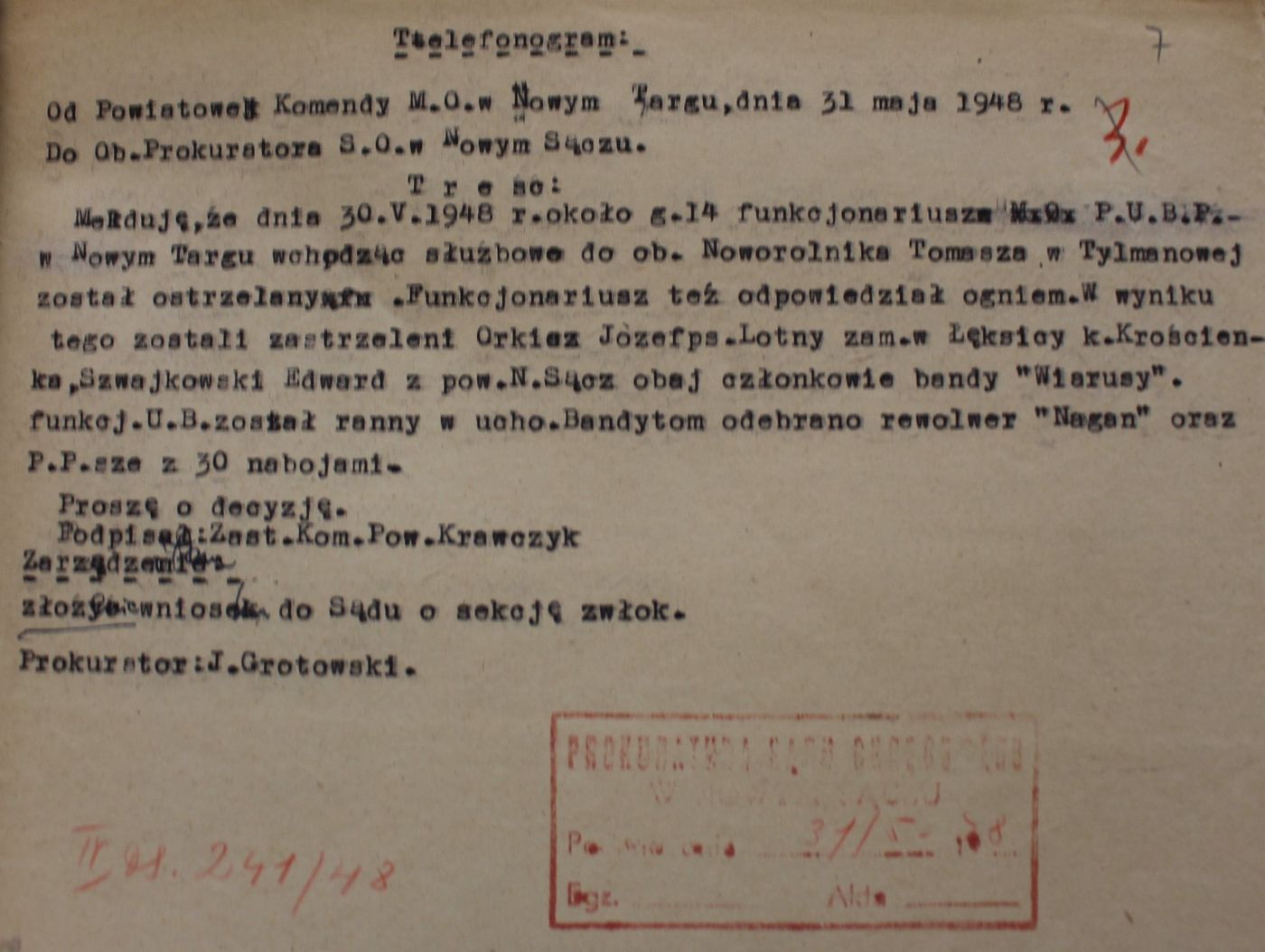 Telefonogram PK MO w Nowym Targu do prokuratora Sądu Okręgowego w Nowym Sączu informujący o śmierci Józefa Orkisza „Lotnego” i Edwarda Szwejkowskiego „Łotra” (APN) -