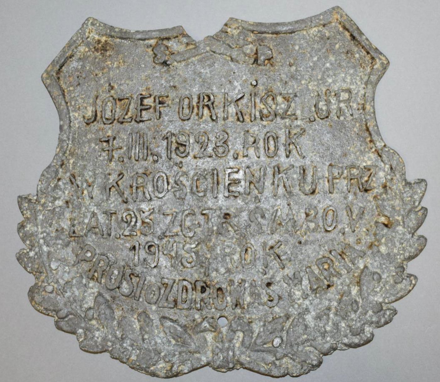 Tabliczka z grobu Józefa Orkisza, odnaleziona podczas prac poszukiwawczych, po konserwacji (fot. Agnieszka Żydzik-Białek) -