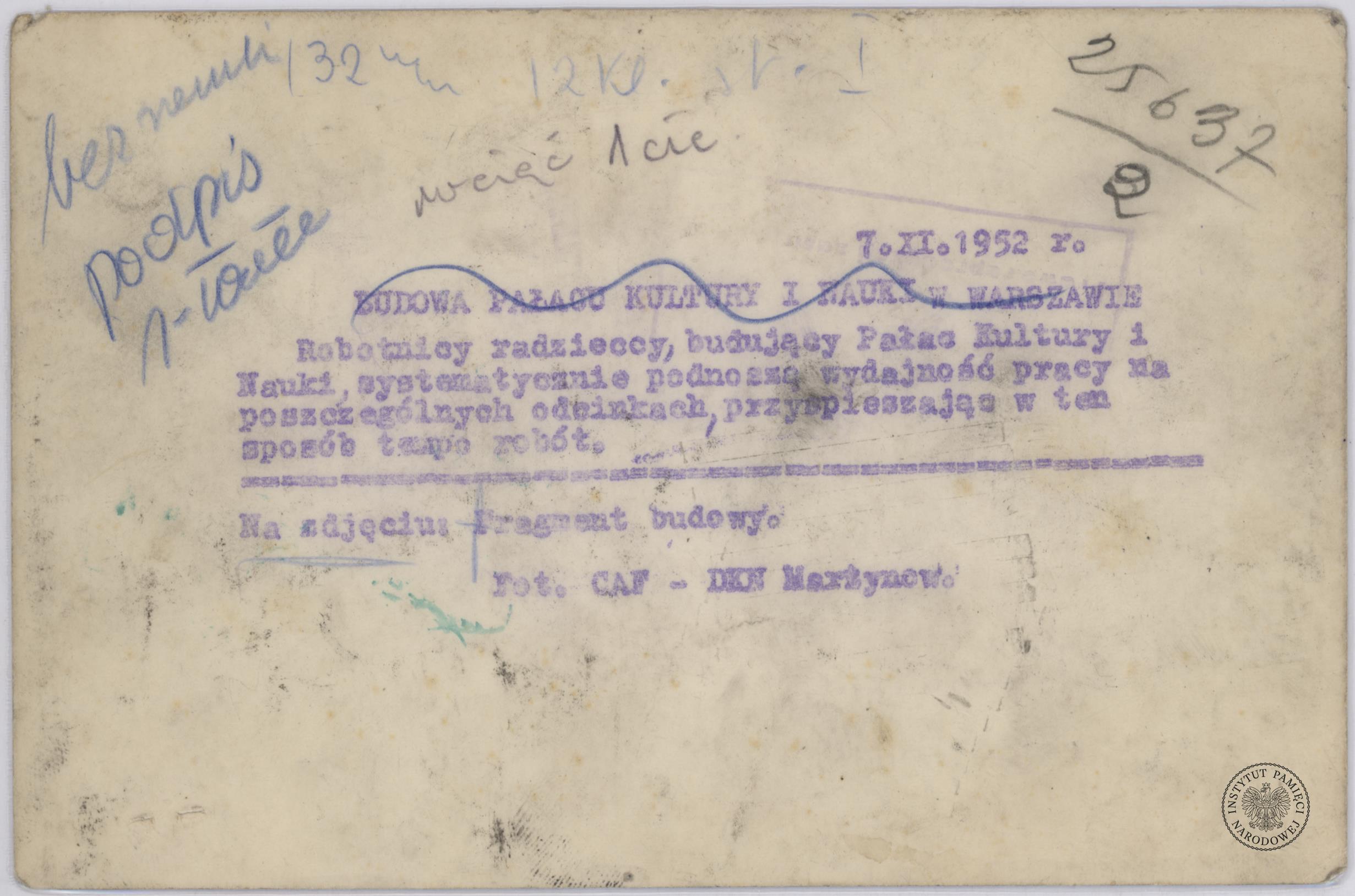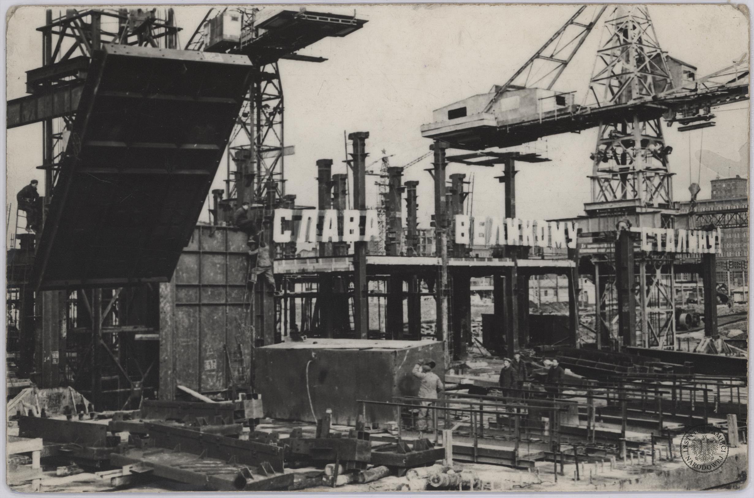 IPNBU-3-20-17-1, Fragment placu budowy Pałacu Kultury i Nauki (do 1956 r. im. Józefa Stalina) w Warszawie - zbliżenie. Na elementach konstrukcji szyld okolicznościowy w j. rosyjskim ku czci Józefa Stalina (tłum "Chwała Wielkiemu Stalinowi"). Źródło: AIPN -