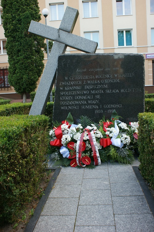 Wobec braku świątyni, lokalnym miejscem modlitwy stał się drewniany krzyż na skraju miejscowości. Postawiono go w 1957 r., gdy na fali „październikowej” odwilży mieszkańcom Kraśnika Fabrycznego udało się wymóc możliwość zorganizowania w tym miejscu – w warunkach polowych – uroczystości I Komunii Świętej dla swoich dzieci.