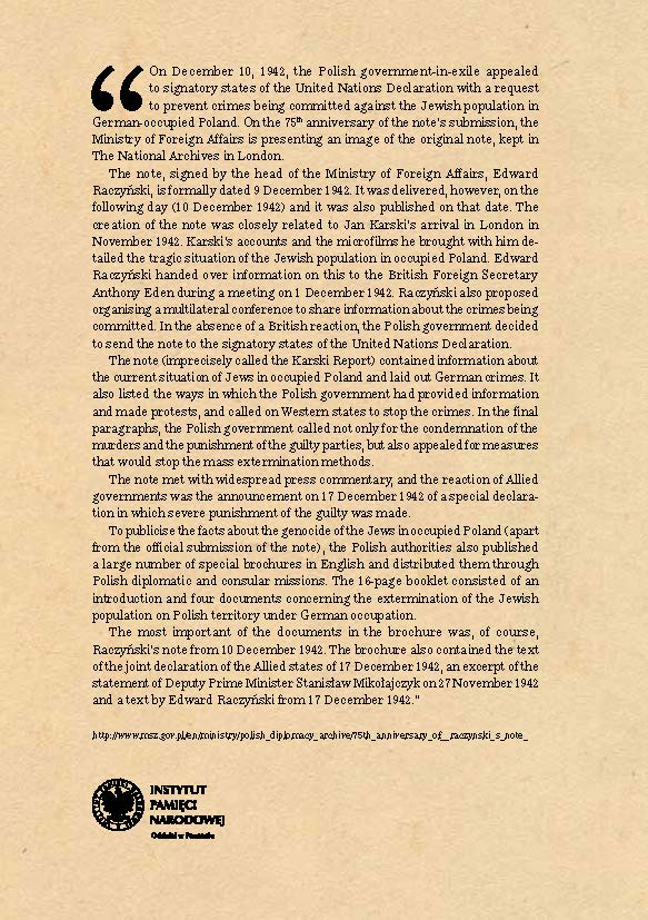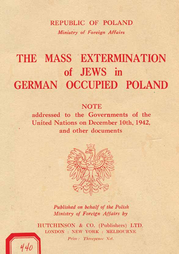 Władze polskie, próbując nagłośnić fakty ludobójstwa Żydów na terenie okupowanej Polski (poza oficjalnym złożeniem noty), zdecydowały się także na opublikowanie specjalnej broszury „The Mass Extermination of Jews in German Occupied Poland” w wysokim nakładzie w języku angielskim i dystrybuowanie jej m.in. przez polskie placówki dyplomatyczne i konsularne. W rezultacie ogłoszono szesnastostronicową broszurę, składającą się ze wstępu i z czterech dokumentów dotyczących eksterminacji ludności żydowskiej na terenie Polski pod okupacją niemiecką.