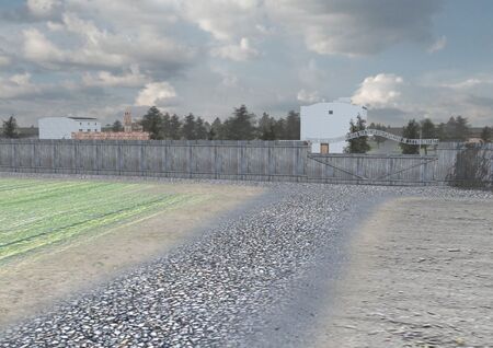 Zrekonstruowana wieża strażnicza wraz z ogrodzeniem (punkt „W”) (Mapa multimedialna niemieckiego obozu pracy dla polskich dzieci przy ul. Przemysłowej w Łodzi/IPN Oddział w Łodzi).