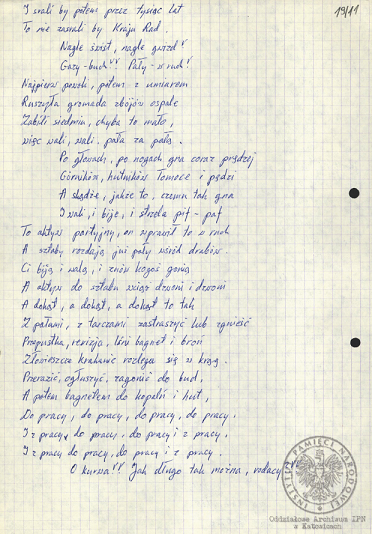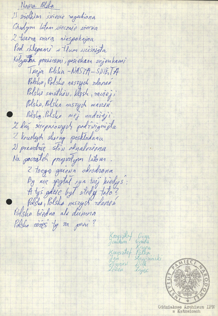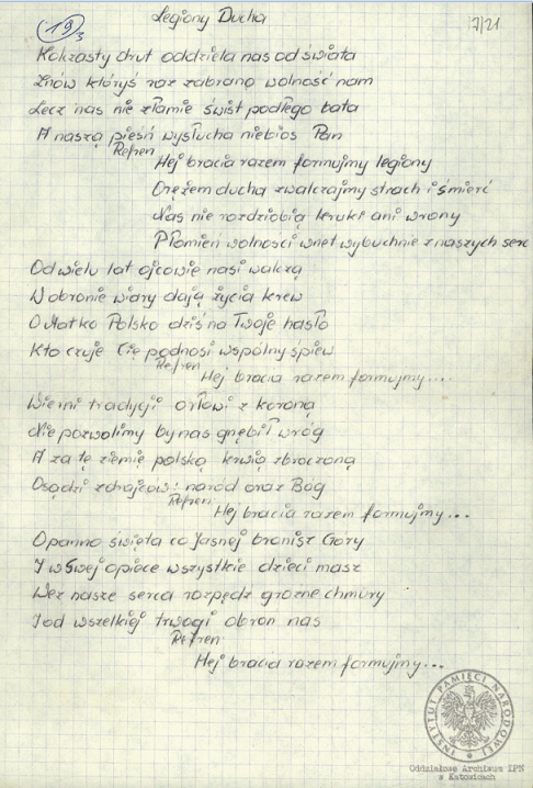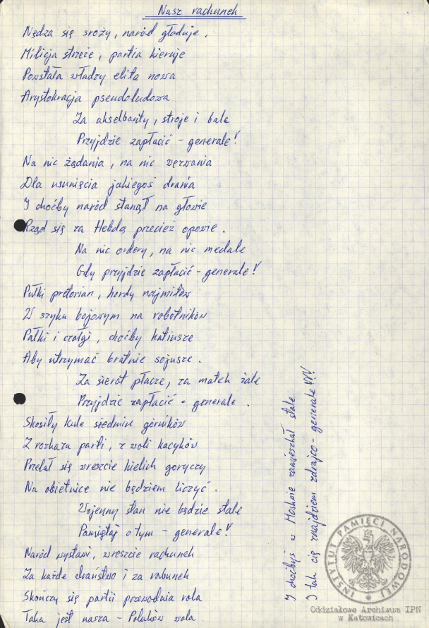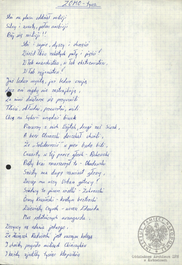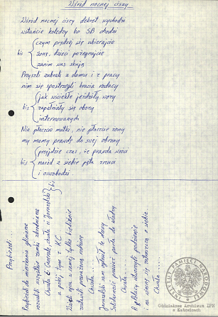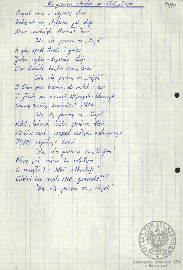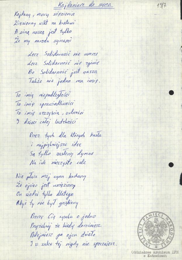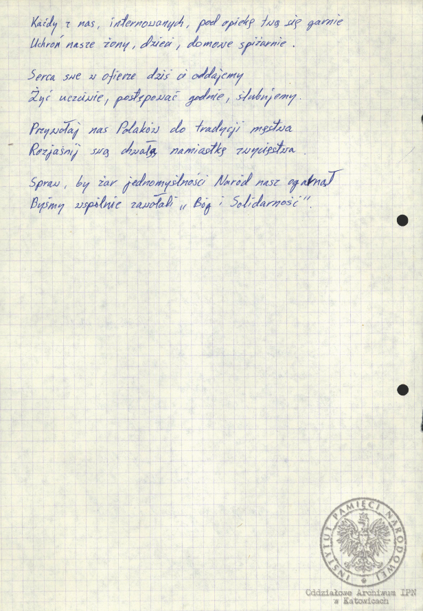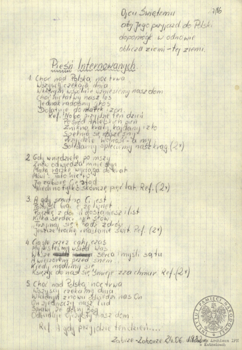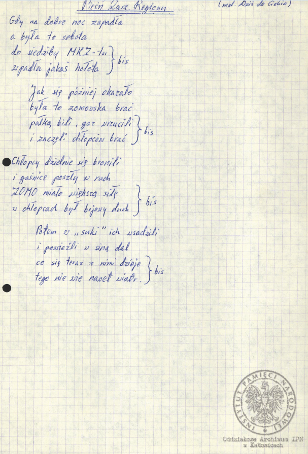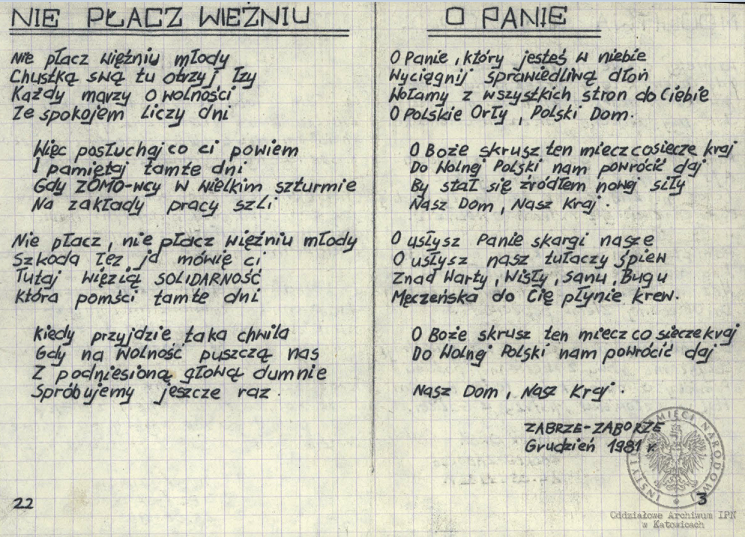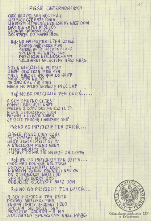 „Pieśń internowanych”, akta Ryszarda Pytlika, pracownika KWK „Manifest Lipcowy” i członka prezydium Rady Współpracy Samorządów Pracowniczych Regionu Śląsko-Dąbrowskiego, internowanego w Zabrzu-Zaborzu (AIPN Ka 043/525, t. 1, k. 15). -