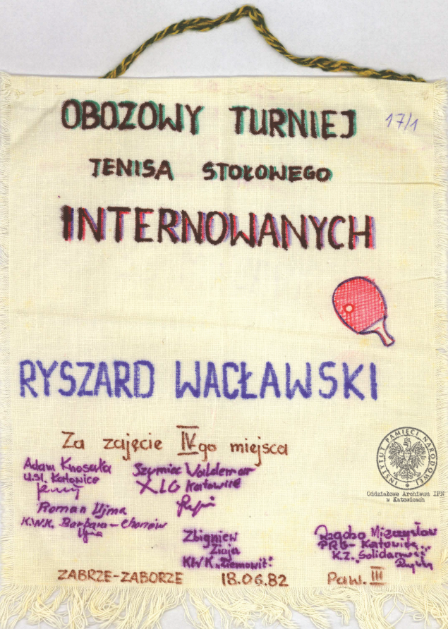 Proporczyk z obozowego turnieju tenisa stołowego zachowany w aktach Ryszarda Wacławskiego, internowanego w Zabrzu-Zaborzu (AIPN Ka 043/1245, k. 17/1). -