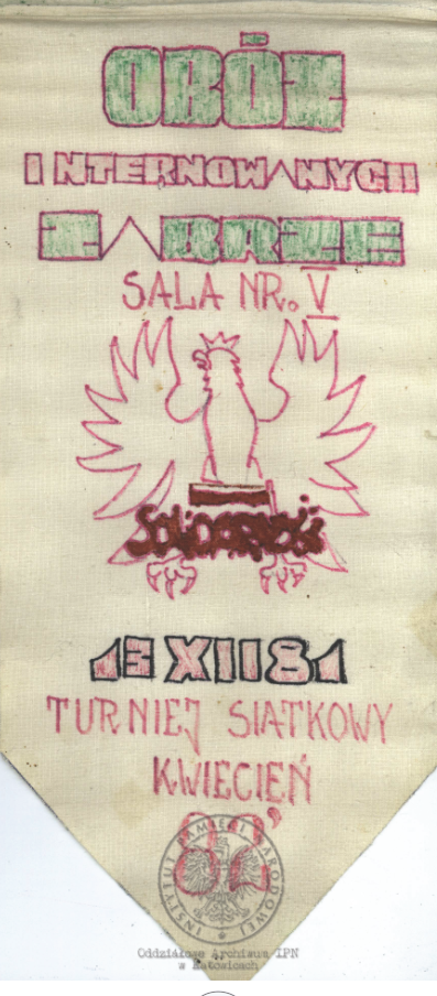 Proporczyk z obozowego turnieju siatkówki zachowany w aktach Andrzeja Stralera, internowanego w Zabrzu-Zaborzu (AIPN Ka 043/1201, k. 7/4). -