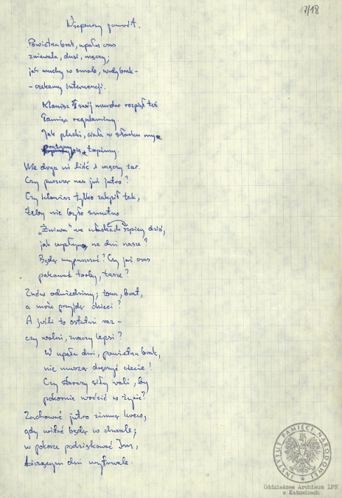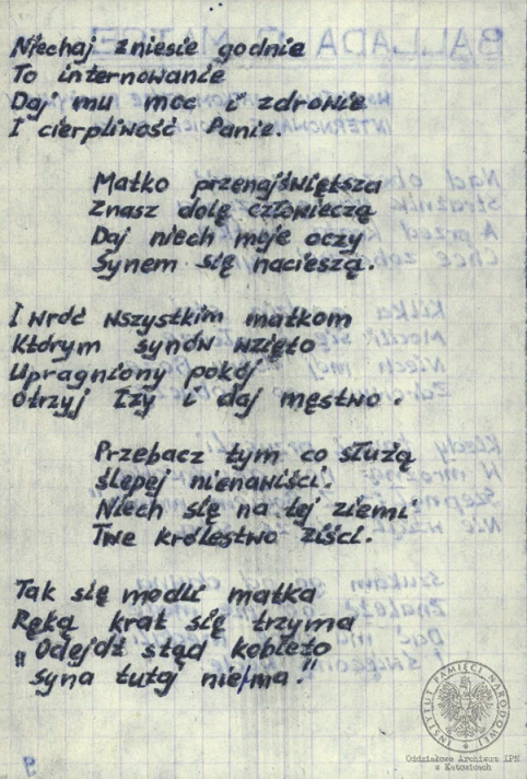 Wiersze, pieśni i modlitwy internowanych odnalezione w aktach Alfreda Cofalika, pracownika KWK „Szczygłowice, organizatora NSZZ „S” i KPN w tej kopalni, internowanego w Zabrzu-Zaborzu, Strzelcach Opolskich i Uhercach (AIPN Ka 043/1008). -