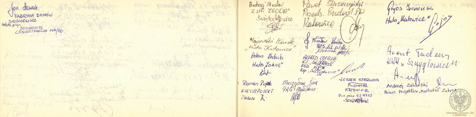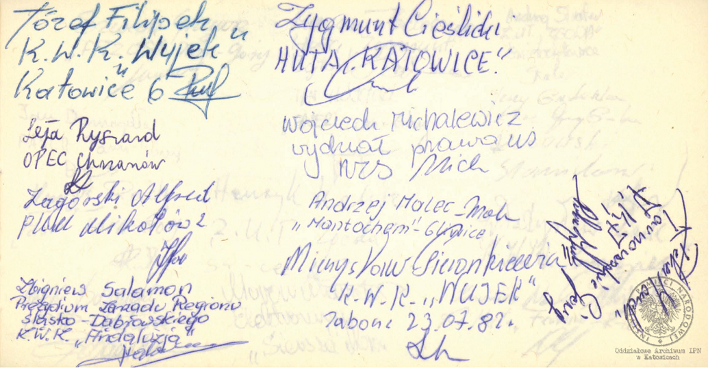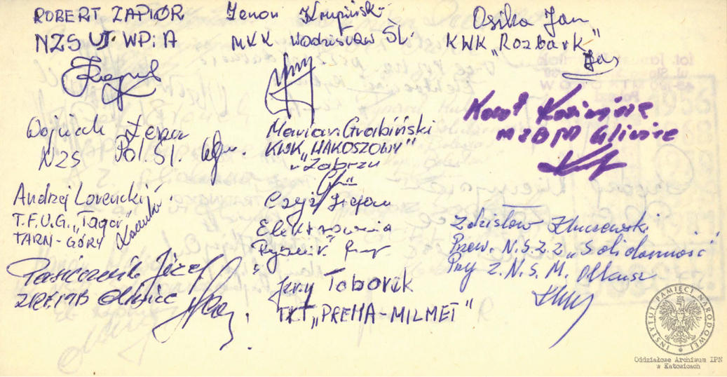 Makatki z podpisami internowanych ofiarowane Alfredowi Cofalikowi, pracownikowi KWK „Szczygłowice, organizatorowi NSZZ „S” i KPN w tej kopalni, z okresu internowania w Zabrzu-Zaborzu (AIPN Ka 043/1008, k. 19). -