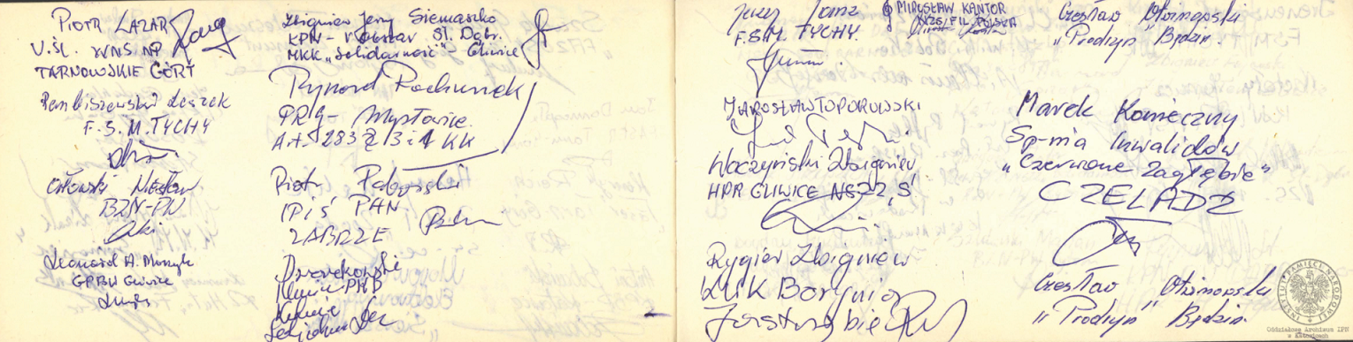 Pamiętnik z wpisami internowanych odnaleziony w aktach Józefa Bujoczka, pracownika KWK „Julian”, internowanego w Zabrzu-Zaborzu i Uhercach (AIPN Ka 043/985, t. 2, k. 7/29).