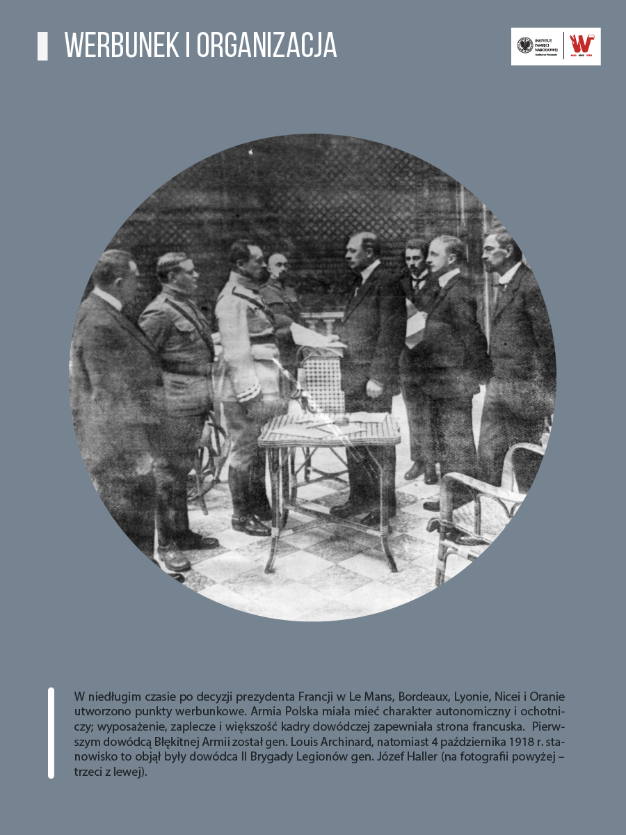 Dekret o powołaniu Armii Polskiej we Francji, podpisany przez prezydenta III Republiki Raymonda Poincarégo, został opublikowany 4 czerwca 1917 roku. W dokumencie znalazły się zapisy o armii autonomicznej, ochotniczej i walczącej „pod sztandarem polskim”, ale podległej komendzie i regulaminom francuskim, utrzymywanej przez rząd tego kraju. W szeregach planowanych oddziałów walczyć mieli Polacy biorący udział w wojnie jako żołnierze armii francuskiej oraz ochotnicy, przybywający z innych części świata. Z biegiem czasu utworzony w lecie 1917 r. paryski Komitet Narodowy Polski, w którego skład wchodzili m.in. Roman Dmowski, Ignacy Paderewski, Erazm Piltz i Stanisław Grabski, przejmował polityczną kontrolę nad wojskiem. To KNP zdecydował o mianowaniu w październiku 1918 r. jego nowego dowódcy – Polaka, gen. Józefa Hallera.