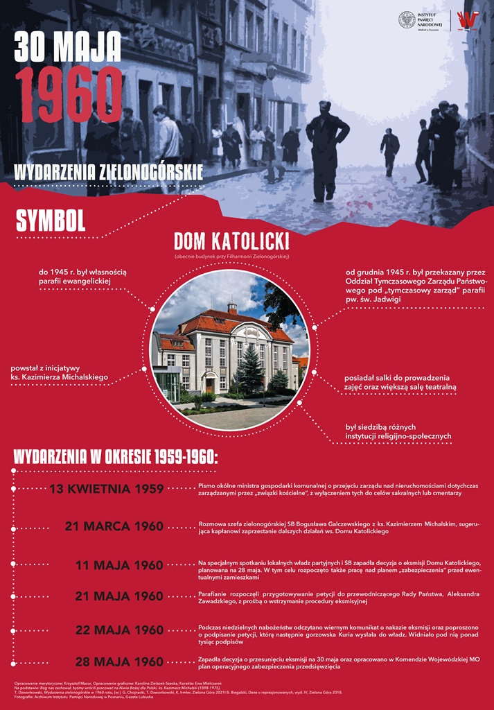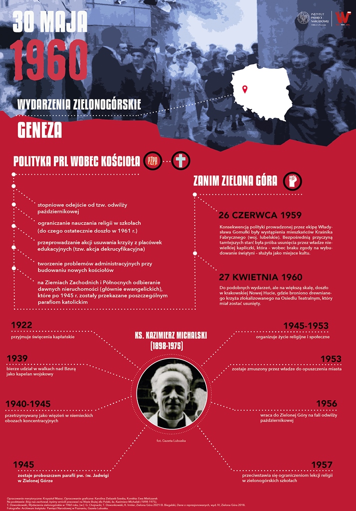 30 maja 1960 r. na ulicach Zielonej Góry doszło do starć między mieszkańcami a siłami milicyjnymi. Wypadki, określane jako Wydarzenia Zielonogórskie, były pokłosiem decyzji o eksmisji parafii św. Jadwigi z tzw. Domu Katolickiego, który odgrywał istotną rolę w życiu lokalnej społeczności, podobnie jak pierwszy polski proboszcz w tym mieście – ks. Kazimierz Michalski.